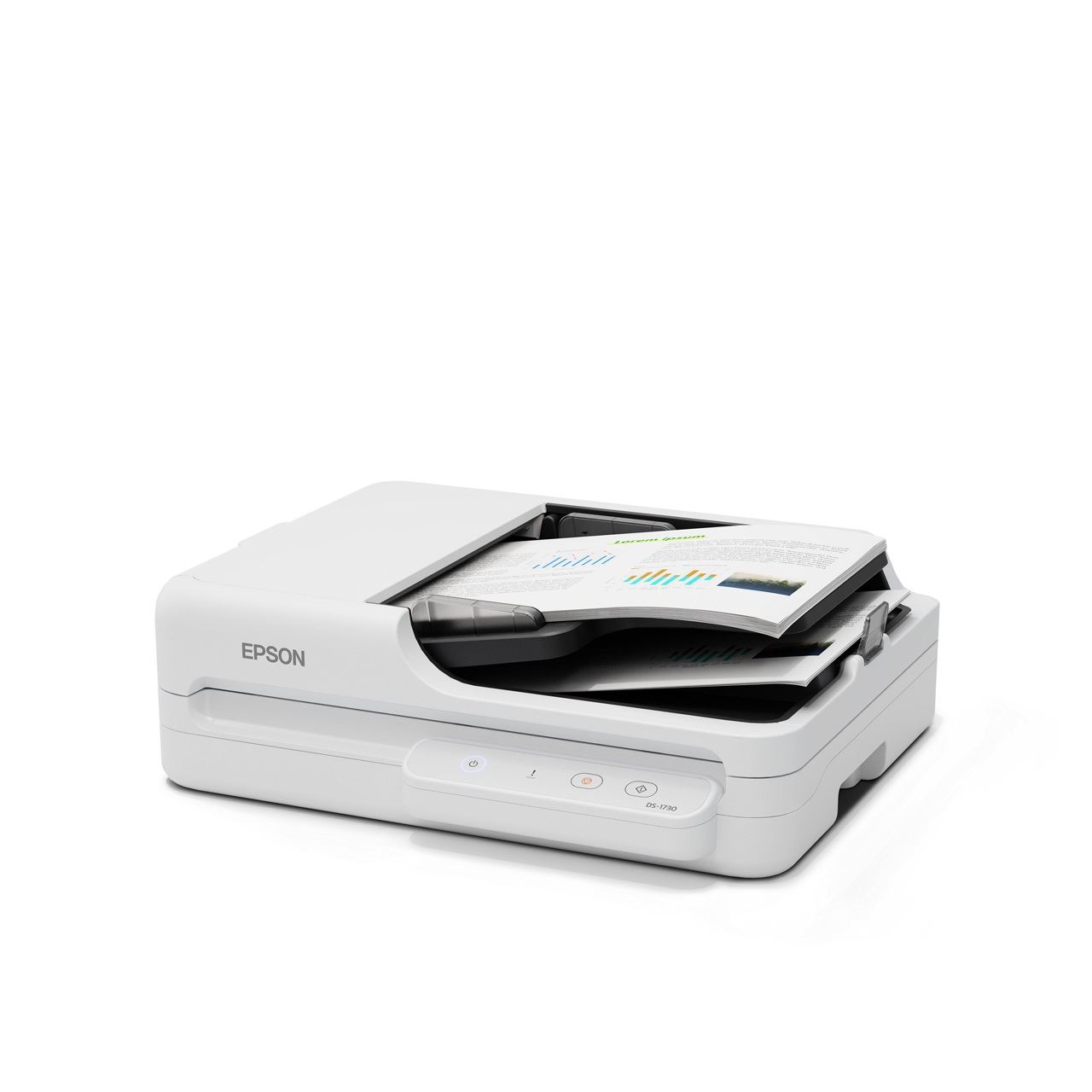 Epson WorkForce DS-1730. Maximale Scan-Abmessung: 215,9 x 297 mm, Optische Scan-Auflösung: 1200 x 1200 DPI, Eingabe Farbtiefe: 30 Bit. Scanner-Typ: Flachbett- & ADF-Scanner, Produktfarbe: Schwarz, Weiß. Sensor-Typ: CIS, Tägliche Einschaltdauer (max): 3000 Seiten, Lichtquelle: RGB-LED. Kapazität der Papiereingabe (Standard): 60 Blätter. Maximale Papiergröße der ISO A-Serie: A4, Unterstützte Scan-Medientypen: Visitenkarte, Plastik-Karte, ISO-A-Formate (A0...A9): A4, A5, A6