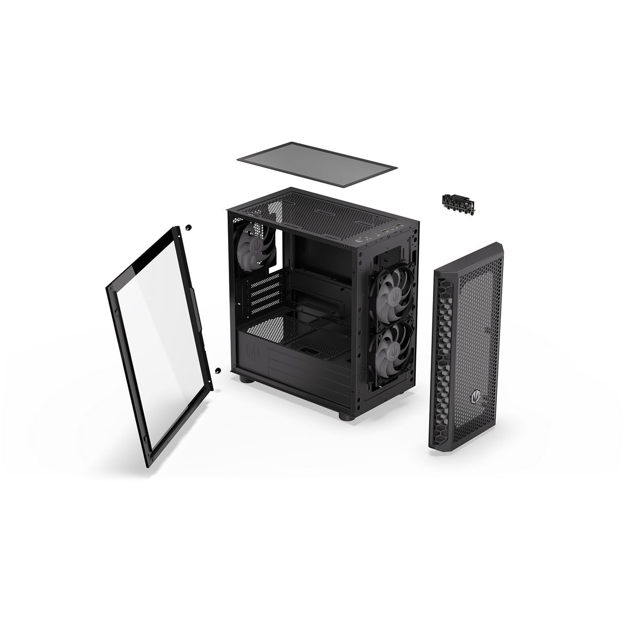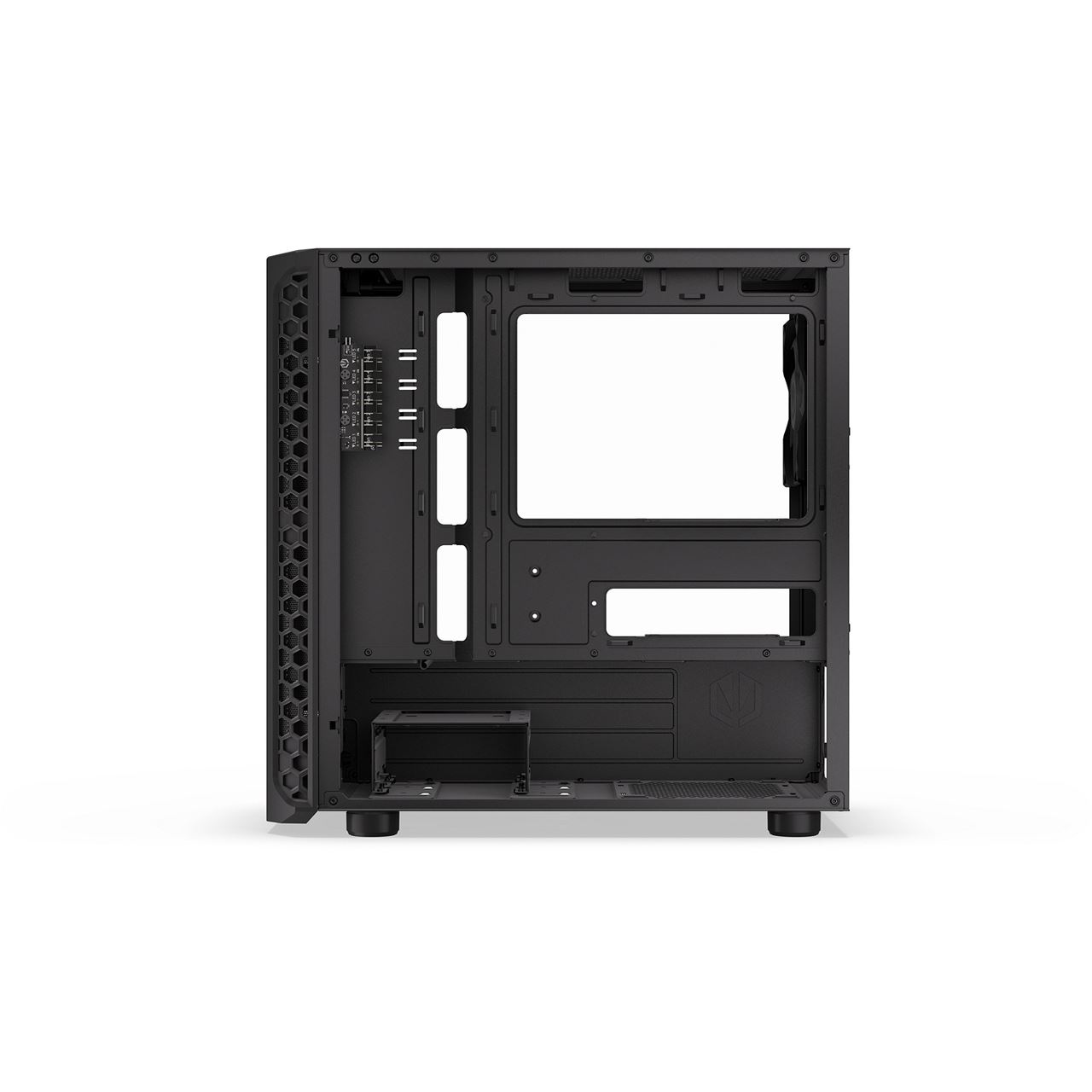 Trotz seiner kompakten Maße von 387 × 205 × 401 Millimetern bietet das Gehäuse ausreichend Platz für leistungsstarke Komponenten. Grafikkarten mit einer Länge von bis zu 345 Millimetern finden ebenso Platz wie CPU-Luftkühler mit einer Höhe von bis zu 159 Millimetern. Auch Netzteile bis 180 Millimeter Länge lassen sich problemlos integrieren. Zusätzlich stehen Einbaumöglichkeiten für zwei 3,5-Zoll- und zwei 2,5-Zoll-Laufwerke zur Verfügung. Das Zweikammer-Design unterstützt microATX-, Mini-ITX- und FlexATX-Mainboards und ermöglicht eine saubere Trennung von Komponenten und Netzteilbereich.