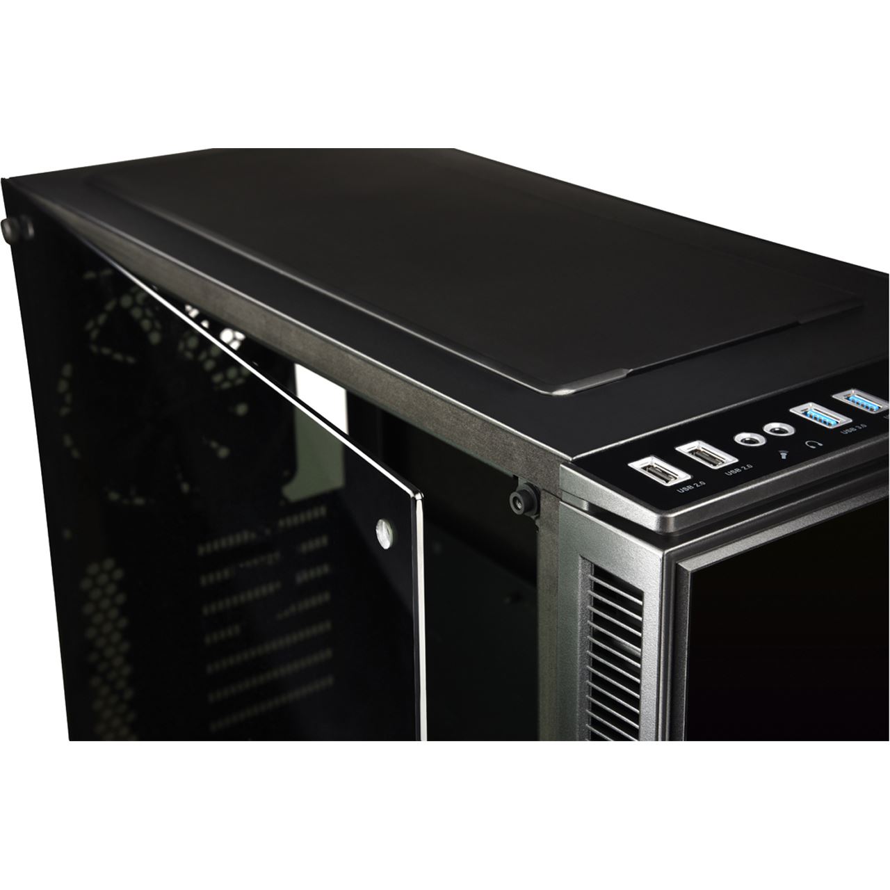 Wer ein mehr als ein laues Lüftchen mag kommt auch beim EQUILENCE voll auf seine Kosten, da 360 mm/280 mm/ und 240 mm Kühler oder bis zu neun Lüfter in der Konfiguration unterstützt werden. Hinten ist ein 140 mm Lüfter bereits verbaut, aber auch eine kleinere Variante mit 120 mm könnte montiert werden. Von oben finden entweder drei 120 mm Lüfter oder zwei 140 mm Lüfter ihren Platz. Allerdings wird an dieser Stelle auch der Einsatz von Wasserkühlungssystemen mit 360 mm/ 280 mm/ oder 240 mm unterstützt. Auch auf der rechten Seite ist ausreichend Platz für bis zu zwei Wasser-Kühlsystemen von 120 mm oder eines mit 240 mm. Abgerundet wird der Windkanal mit bis zu drei unterstützten 120mm Wasser-Kühlsystemen an der Front. An dieser Stelle sei gesagt, dass bereits zwei 120mm Lüfter verbaut sind. Die Geschwindigkeit von bis zu sechs Lüfter kann in einem drei Stufen System von der Front aus angeschlossen und gesteuert werden. So findet Ihr die optimale Balance zwischen Stille und Kälte. Aber das ist nicht das Einzige was Euch an dieser Stelle den Atem verschlagen wird. Denn das Backlit I/O beinhaltet zweimal USB 3.0, zweimal USB 2.0 und einen HD Audio Socket. Natürlich mit Staubschutz. Für all diejenigen, die jetzt immer noch das gewisse Extra suchen: Das Top Cover ist abnehmbar.