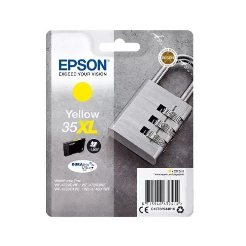 Epson Padlock Singlepack Yellow 35XL DURABrite Ultra Ink. Tintenpatronenkapazität: Hohe (XL-) Ausbeute, Farbiger Tintentyp: Tinte auf Pigmentbasis, Seitenergebnis Farbtinte: 1900 Seiten, Volumen Farbtinte: 20,3 ml, Menge pro Packung: 1 Stück(e)