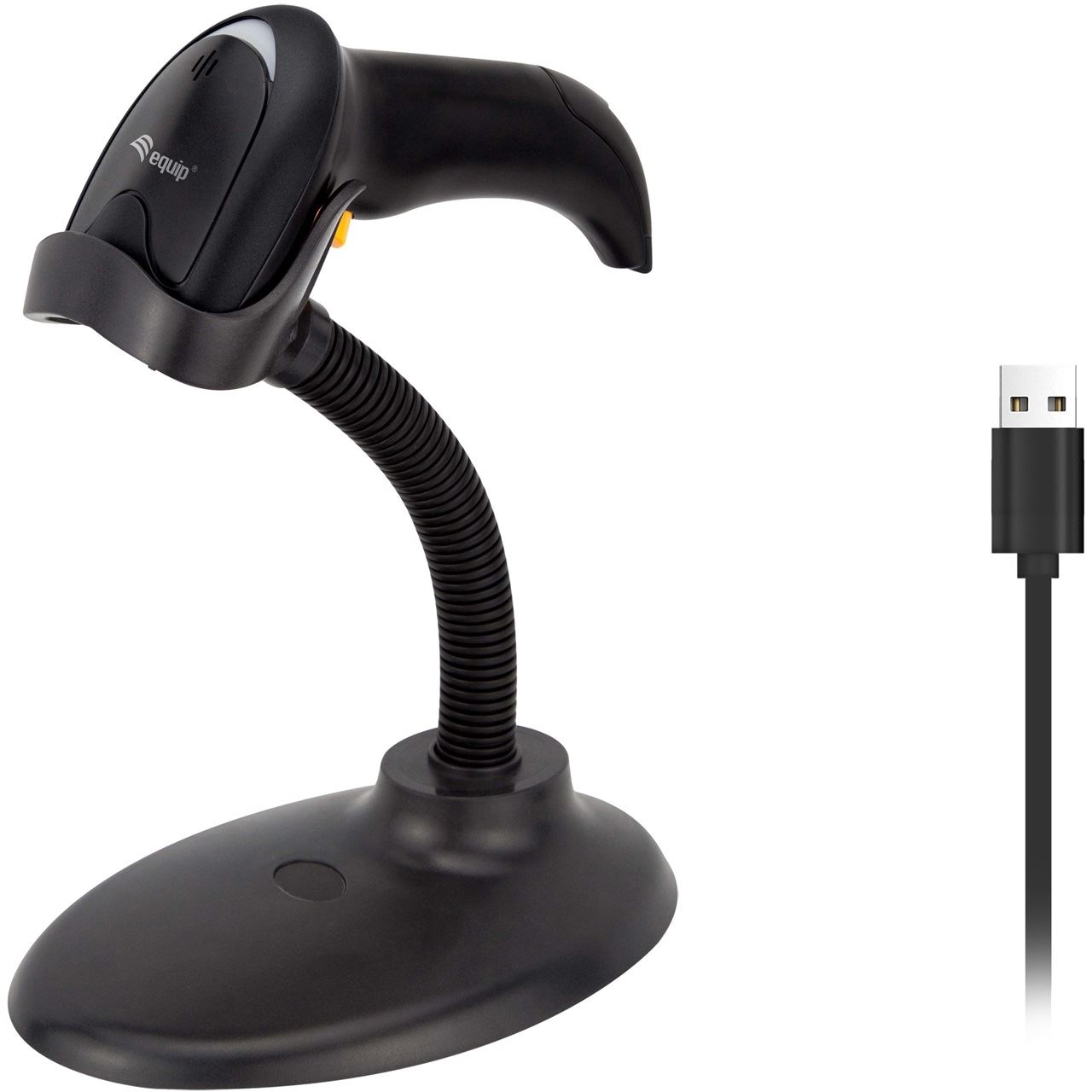 Equip USB 1D Laser-Barcodescanner, mit Ständer. Typ: Tragbares Barcodelesegerät, Scanner-Typ: 1D, Sensor-Typ: Laser. Übertragungstechnik: Kabelgebunden, Standard-Schnittstellen: USB, Kabellänge: 1,8 m. Produktfarbe: Schwarz, Gehäusematerial: Acrylnitril-Butadien-Styrol (ABS), Internationale Schutzart (IP-Code): IP54. Energiequelle: USB, Eingangsspannung: 5 V. Gewicht: 106 g, Breite: 70 mm, Tiefe: 79 mm