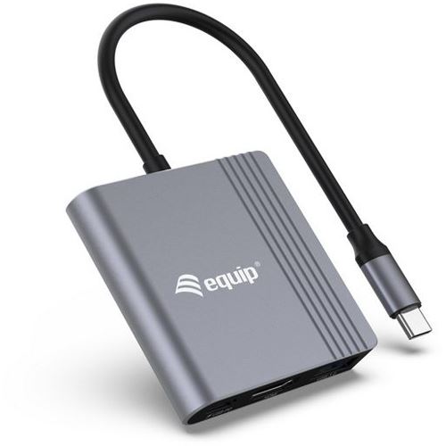 Equip 3-in-1-USB-C-zu-HDMI-/USB-A-/USB-PD-Adapter. USB-Version: 3.2 Gen 1 (3.1 Gen 1), USB-Stecker: USB Typ-C, USB-Anschluss Geschlecht: Männlich. Produktfarbe: Schwarz, Grau, Gehäusematerial: Aluminium. Unterstützt Windows-Betriebssysteme: Windows 10, Windows 10 Education, Windows 10 Education x64, Windows 10 Enterprise, Windows 10..., Unterstützt Mac-Betriebssysteme: Mac OS X 10.10 Yosemite, Mac OS X 10.11 El Capitan, Mac OS X 10.12 Sierra, Mac OS X 10.13 High..., Unterstützung anderer Betriebsysteme: Android. Breite: 60 mm, Tiefe: 60 mm, Höhe: 12 mm. Verpackungsart: Box, Verpackungsbreite: 115 mm, Verpackungstiefe: 20 mm
