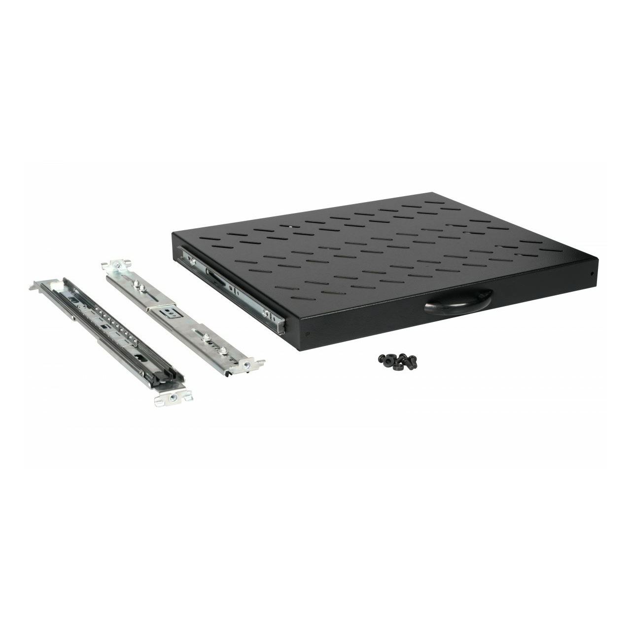 Equip Ausziehbarer Fachboden 19', 1HE, 600mm, Schwarz. Typ: Schiebbare Ablage, Produktfarbe: Schwarz, Ursprungsland: Türkei. Größe (Imperial): 48,3 cm (19"), Breite: 485 mm, Tiefe: 368 mm. Verpackungsbreite: 520 mm, Verpackungstiefe: 390 mm, Verpackungshöhe: 43 mm. Anzahl Kartons pro Palette: 24 Stück(e), Lagenanzahl pro Palette: 3 Stück(e), Produkte pro Palette: 264 Stück(e)
