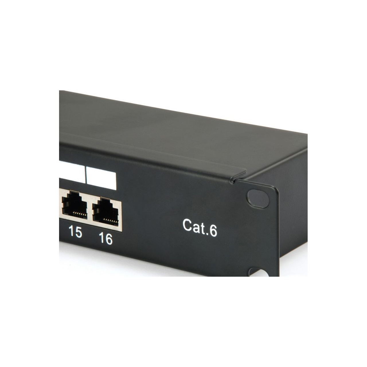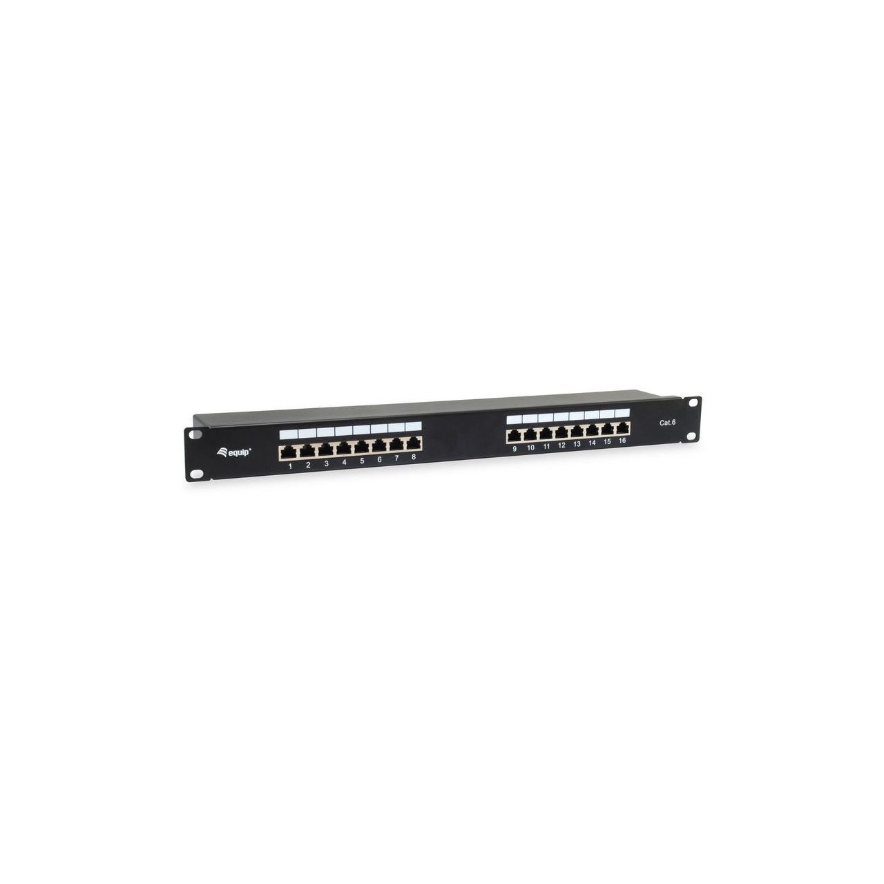 Equip Cat.6 Geschirmtes Patch Panel, Schwarz. Verkabelungstechnologie: 10/100/1000Base-T(X), Ethernet Schnittstellen Typ: Gigabit Ethernet, Maximale Datenübertragungsrate: 1000 Mbit/s. Produktfarbe: Schwarz, Material: Stahl, Montage: Rackeinbau. Konformitätsbescheinigungen: RoHS. Breite: 110,5 mm, Höhe: 44,5 mm, Tiefe: 483 mm. Verpackungsart: Box
