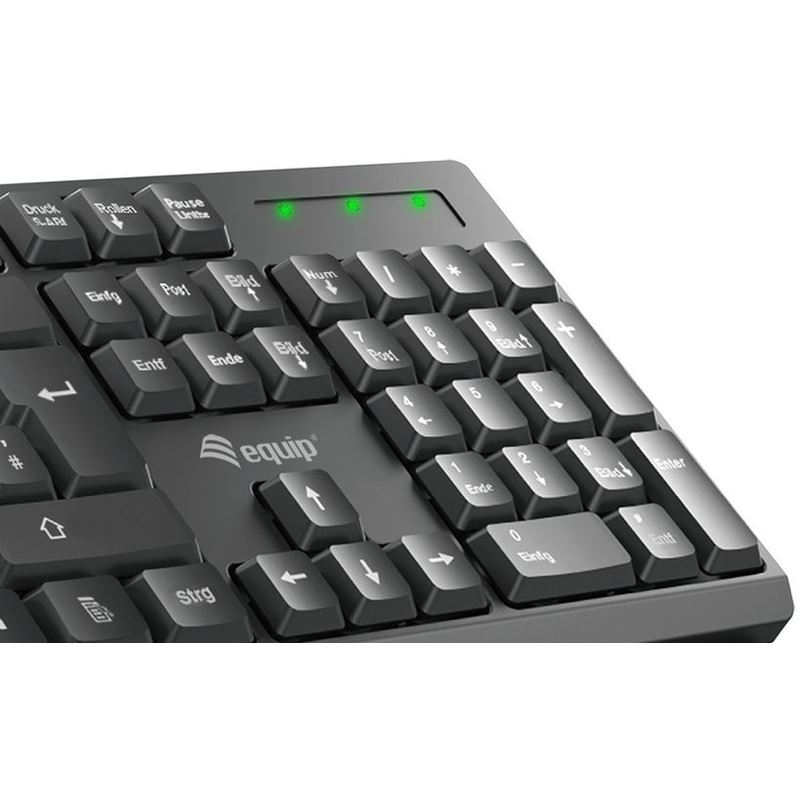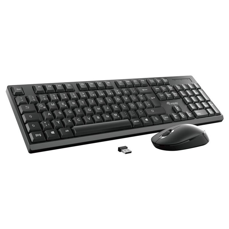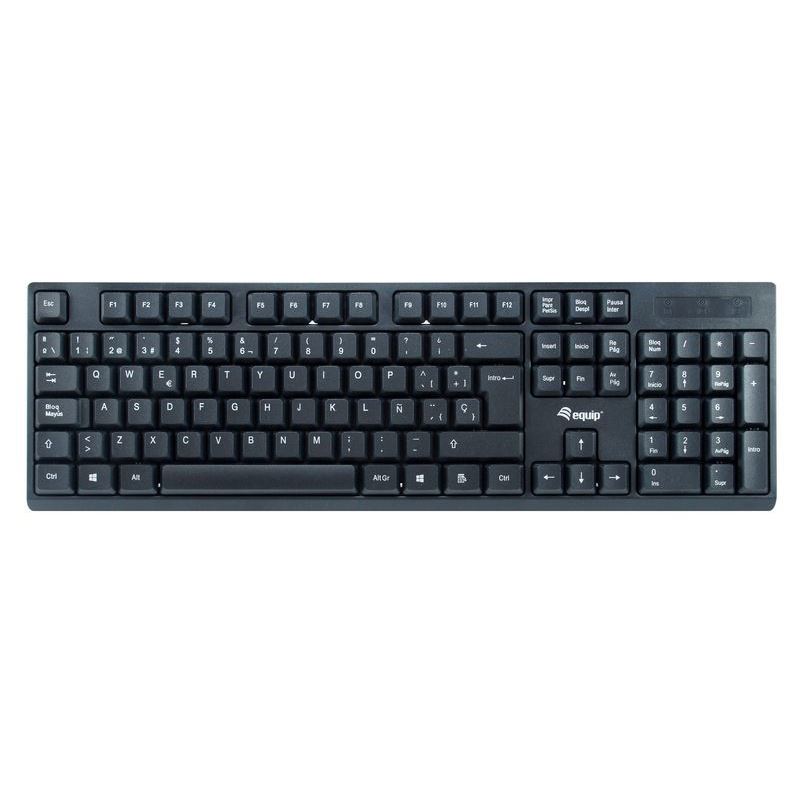 Equip Kabelloses Tastatur und Mausset, ES Layout (QWERTY). Tastatur Formfaktor: Volle Größe (100%). Tastatur-Stil: Gerade. Übertragungstechnik: Kabellos, Geräteschnittstelle: RF Wireless, Tastaturaufbau: QWERTY, Tastatur - Tastenanzahl: 105, Empfohlene Nutzung: Büro. Produktfarbe: Schwarz. Maus enthalten