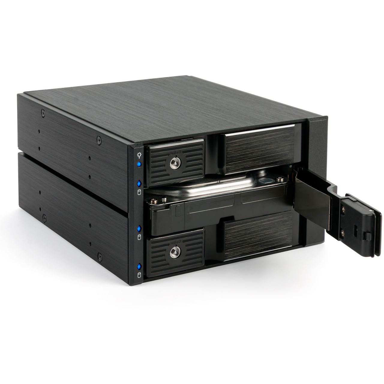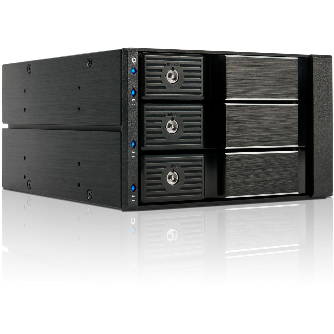 Backplane-Systeme kommen in Servern zum Einsatz und ermöglichen den einfachen Einbau, bzw. Austausch von Festplatten. Durch die Stecktechnik von Festplatten-Einschüben werden die Festplatten über Steckverbindungen und nicht, wie sonst üblich über Kabelverbindungen, ins System eingebunden. Dadurch können die Festplatten werkzeugfrei und ganz einfach, ohne das Servergehäuse öffnen zu müssen, ausgetauscht werden. Die Hot-Swap Technik ermöglicht hierbei zusätzlich den Austausch und Wechsel der Festplatten im laufenden Betrieb.SAS I,II + SATA I,II,III Backplane für 3x 3,5" HDD in einem 2x 5,25" Einschub. Mit einem 70mm Lüfter an der Rückseite. Trägerlos. Aluminiumgehäuse und Front in schwarz.Schnelle, trägerlose Montage und Wechsel der Festplatten ohne SchraubenFür RAID geeignetPlug & PlayHotswapAbschließbarLEDs für Festplatten Status AnzeigeFür 3,5" SAS I,II 6G geeignetFür 3,5" SATA I,II,III 6G geeignet