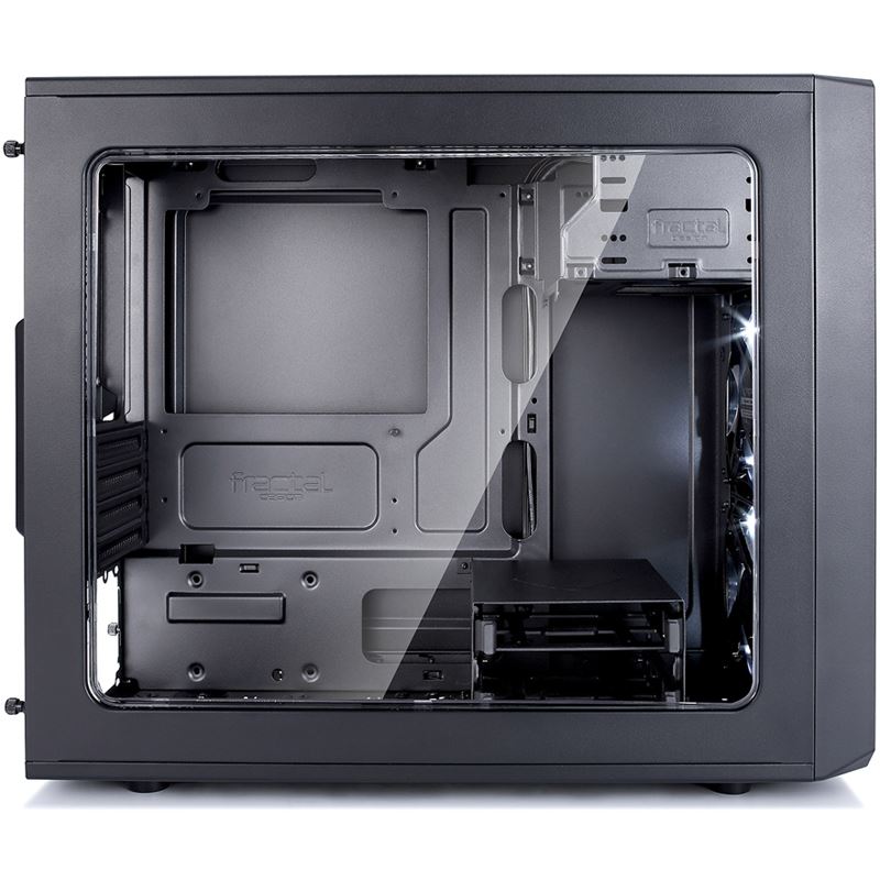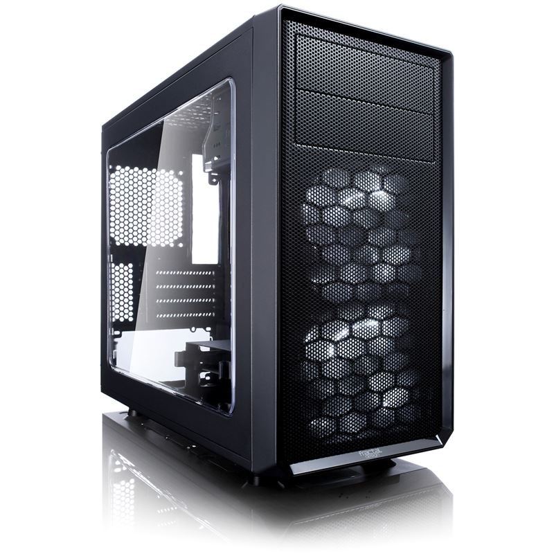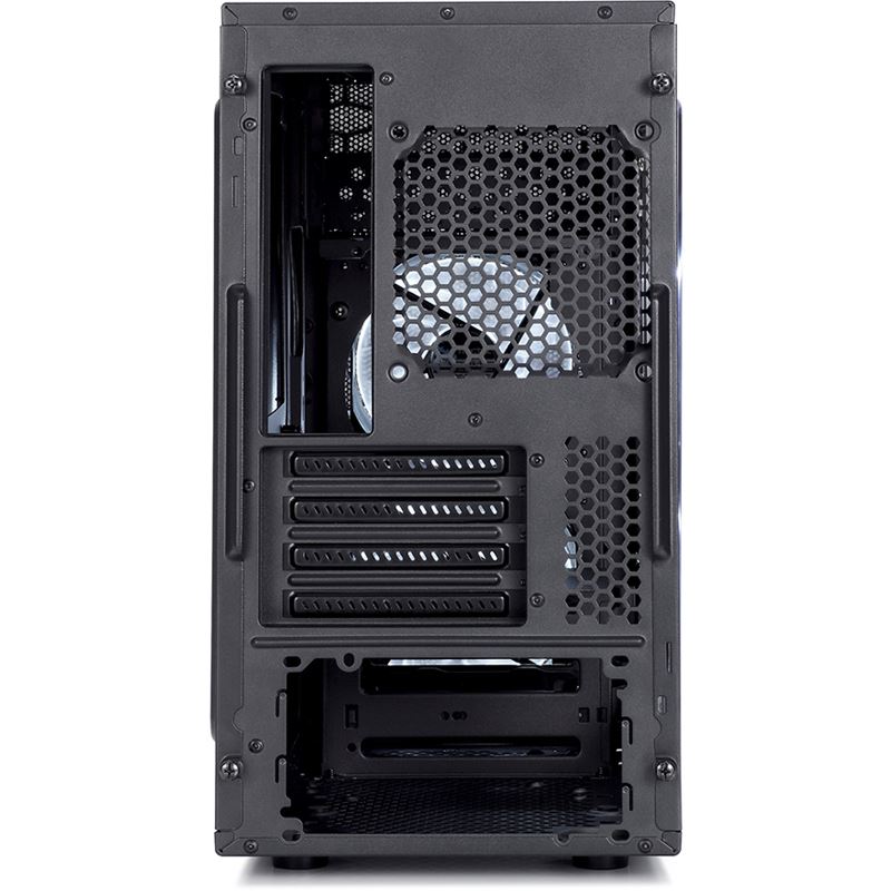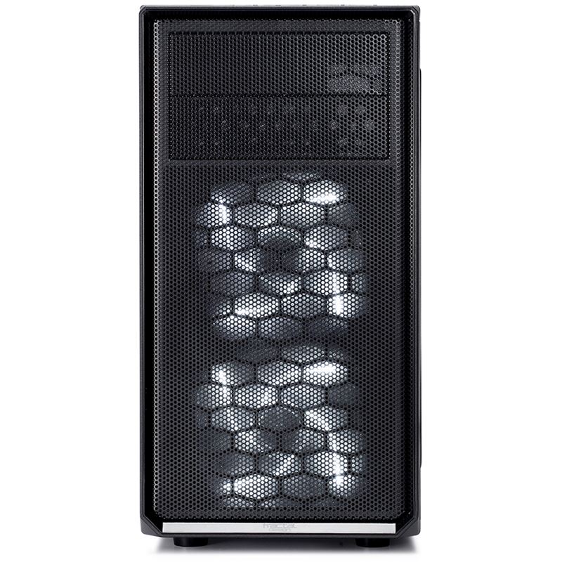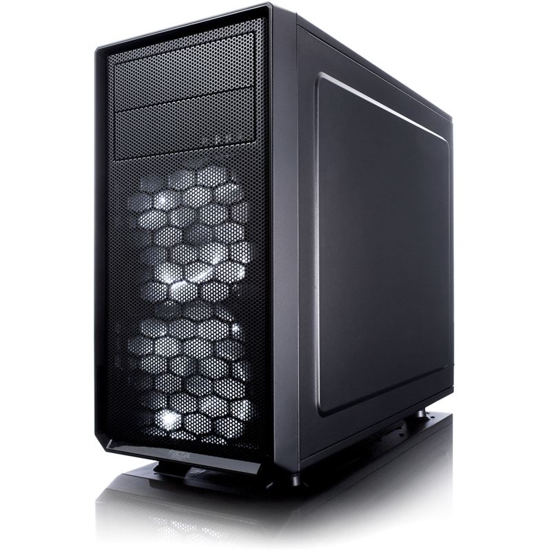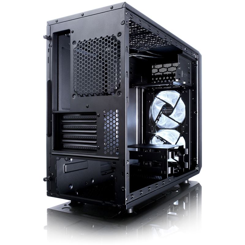 Das schwarze Fractal Design Focus mini G präsentiert sich äußerst kompakt und ist die perfekte Basis für ein elegantes System. Außerdem setzt es die verbaute Hardware mit raffinierten Akzenten gekonnt in Szene. Durch clevere und effiziente Raumnutzung verbindet das Gehäuse ein kompaktes Design mit einem verblüffenden Platzangebot für High-End Komponenten. Dank des großen Sichtfensters und der beiden 120 mm Silent-Series-LL-Lüftern steht stets die Ästhetik des gesamten Setups im Vordergrund. Die weiße LED-Beleuchtung der Lüfter verleiht der Optik ein edles Aussehen und rückt die Hardware in den Fokus.