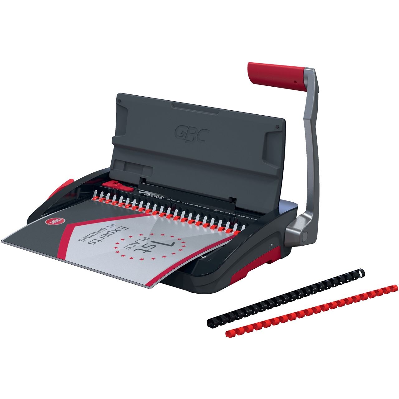 Das CombBind® CB12 ist eine zuverlässiges und kompaktes manuelles Bindegerät, perfekt für den persönlichen Gebrauch oder den Einsatz in kleinen Büros mit geringem Volumenbedarf. Es stanzt mühelos bis zu 12 Blatt 80-g/m²-Papier und kann bei Verwendung von 19-mm-Plastikbinderücken bis zu 165 Blätter gleichzeitig binden. Sein leichtes, platzsparendes Design gewährleistet, den flexiblen Einsatz. Kann bei Nichtgebrauch problemlos verstaut werden. Für zusätzlichen Komfort verfügt es über eine Auffangschale für die einfache Entsorgung des Schnittguts und ein praktisches Aufbewahrungsfach. Verbessern Sie Ihr Dokumentenmanagement mit dem GBC CB12 – hier trifft Funktionalität auf Stil. Mit einem GBC CombBind 12 lassen sich eine Vielzahl von Dokumenten professionell erstellen, darunter Berichte, Präsentationen, Handbücher, Abschlussarbeiten, Notizbücher, Fotobücher, Rezeptbücher und Kalender. Dieses Gerät ist auch ideal für die hochwertige Erstellung von Geschäftsdokumente, Schulungshandbücher, technischen Dokumentationen und kreativen Projekten geeignet. Farbe: Schwarz, Rot und Silber. Verwenden Sie GBC Originalzubehör für ein optimales Ergebnis: GBC CombBind™ Plastikbinderücken A4 12 mm, 100 Stück (Art. Nr. 4028177), GBC LeatherGrain™ Rückkarton Schwarz A4 250 g/m², 100 Stück (Art. Nr. CE040010), & GBC HiClear™ glasklares Deckblatt A4 200 Mikron, 100 Stück (Art. Nr. CE012080E)