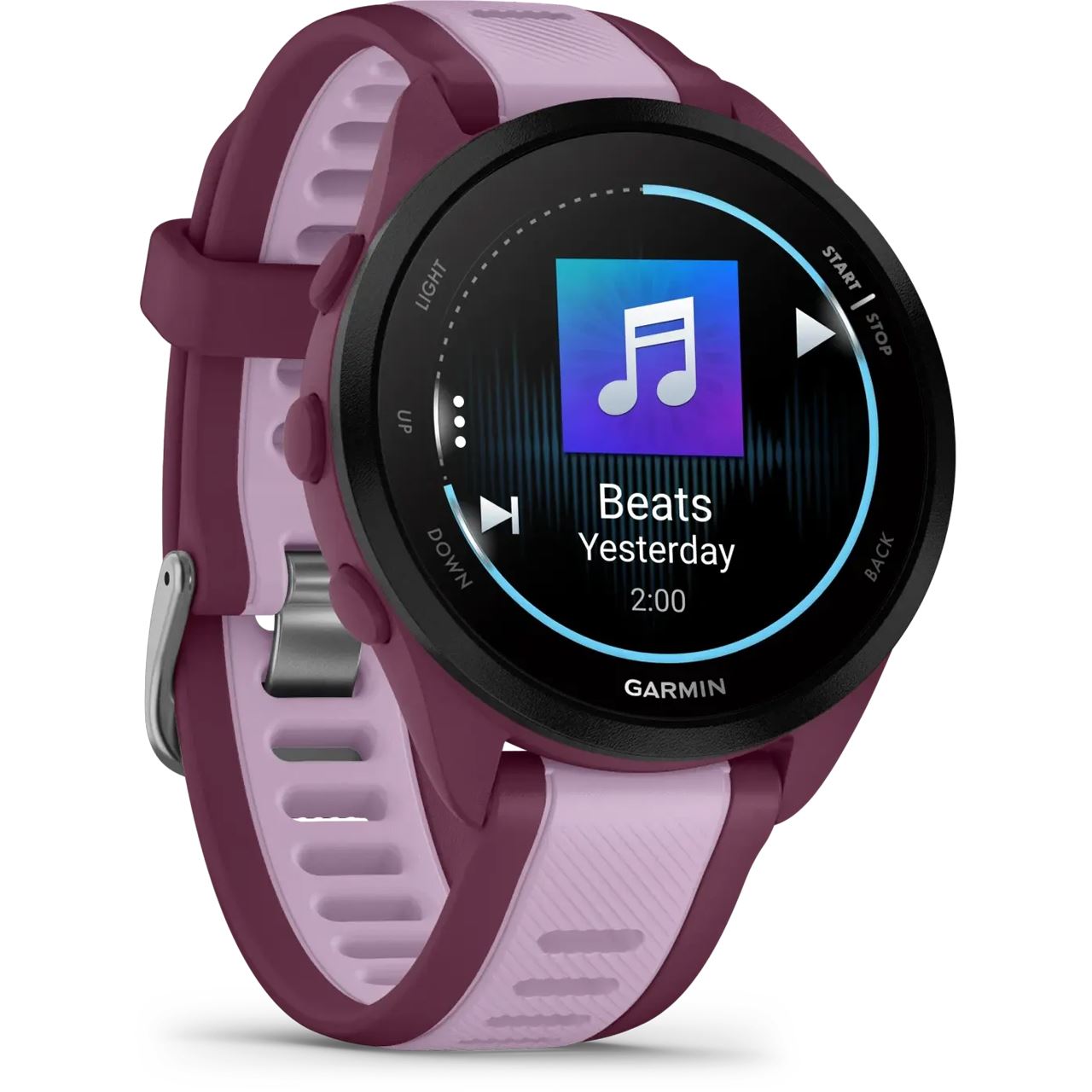 Garmin Forerunner 165 Music. Bildschirmdiagonale: 3,05 cm (1.2"), Bildschirmtechnologie: AMOLED, Display-Auflösung: 390 x 390 Pixel, Touchscreen. Flash-Speicher: 4 GB. GPS. Gewicht: 39 g. Bandmaterial: Silikon, Armbandfarbe: Helles Lila, Violett