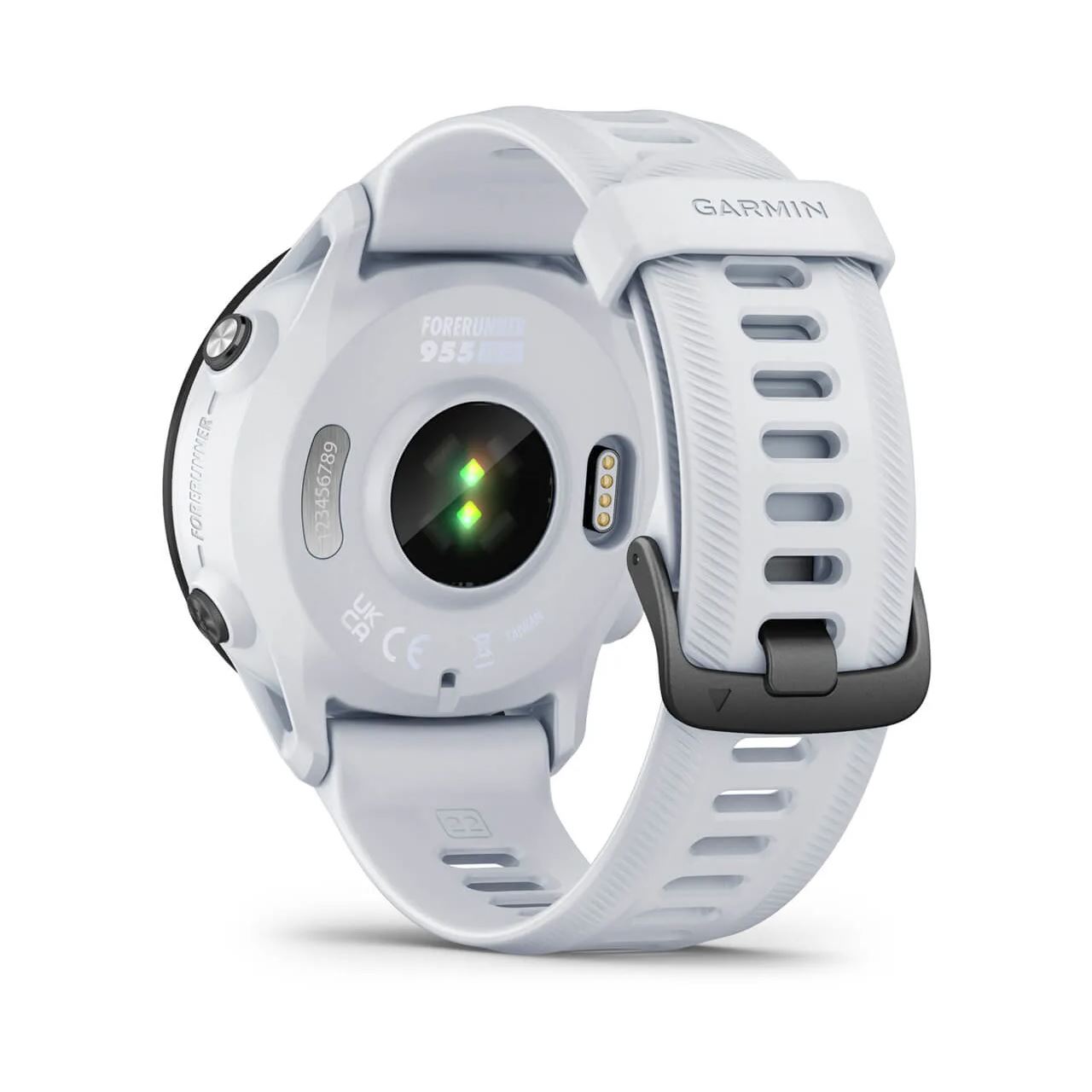 Garmin Forerunner 955. Bildschirmdiagonale: 3,3 cm (1.3"), Bildschirmtechnologie: MIP, Display-Auflösung: 260 x 260 Pixel, Touchscreen. Flash-Speicher: 32 GB. WLAN. GPS. Gewicht: 53 g. Bandmaterial: Silikon, Armbandfarbe: Weiß, Bandgröße: Universalgröße