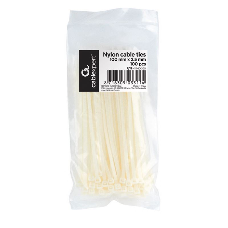 Gembird NYT-100/25. Typ: Kabelbinder mit paralleler Einführung, Material: Nylon, Produktfarbe: Weiß. Länge (mm): 100 mm, Breite: 2,5 mm, Verpackungsbreite: 85 mm. Menge pro Packung: 100 Stück(e). Breite des Versandkartons: 400 mm, Länge des Versandkartons: 420 mm, Höhe des Versandkartons: 200 mm