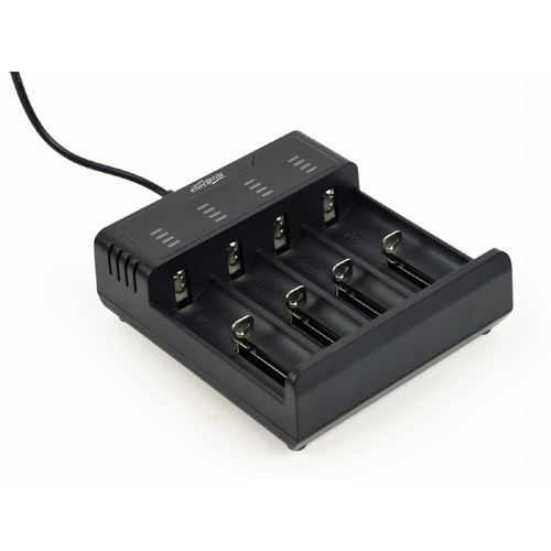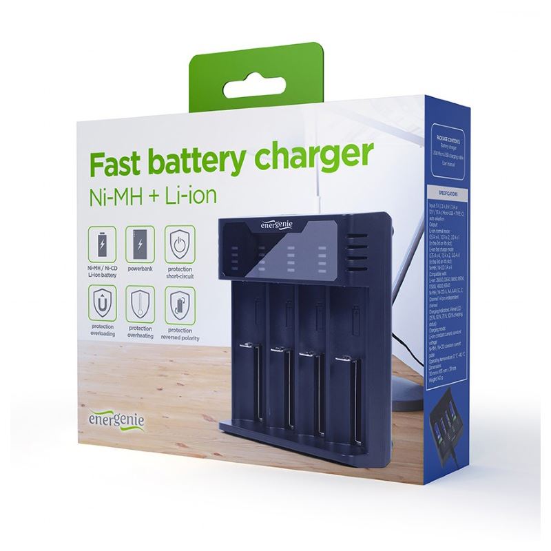Gembird BC-USB-02. Geeignet für: Haushaltsbatterie, Energiequelle: USB, Kompatible Akku-/Batterie-Technologien: Lithium-Ion (Li-Ion), Nickel-Cadmium (NiCd), Nickel-Metallhydrid (NiMH). Produktfarbe: Schwarz, LED-Anzeigen: Ladend. Eingangsspannung: 5 V, Eingangsstrom: 2 A, Ausgangsstrom: 0,5 A. Konformitätsbescheinigungen: RoHS. Breite: 105 mm, Tiefe: 110 mm, Höhe: 39 mm