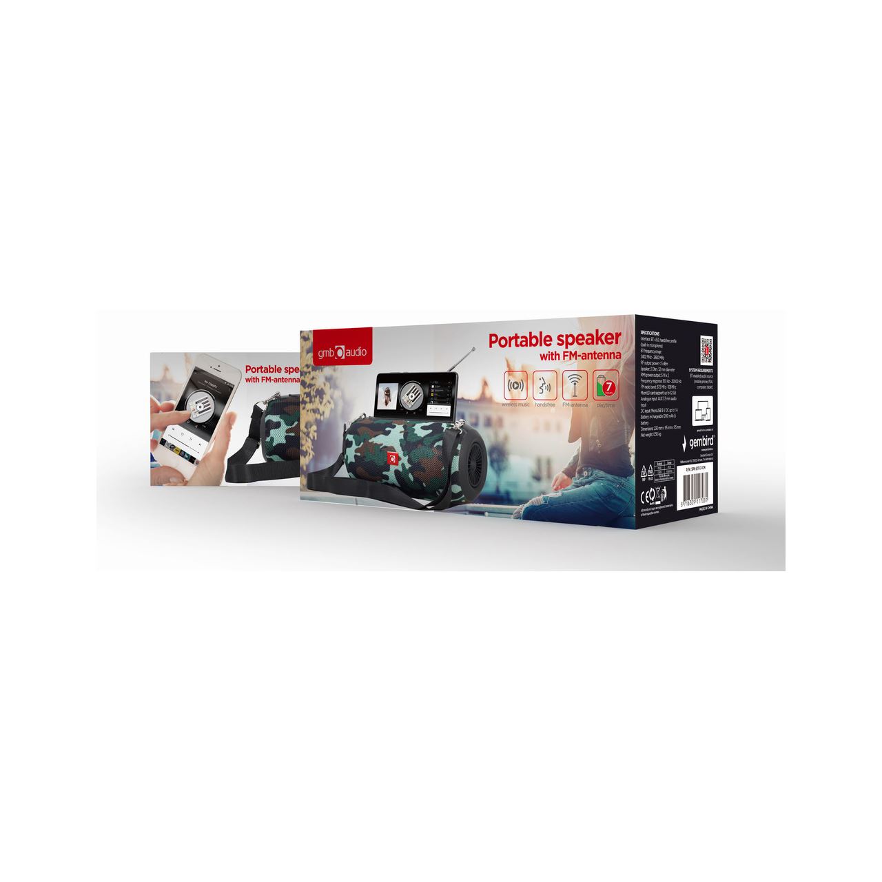 Gembird SPK-BT-17-CM. Treiberdurchmesser: 5,2 cm. RMS-Leistung: 5 W, Lautsprecher RMS-Leistung: 5 W, Frequenzbereich: 100 - 20 Hz. Übertragungstechnik: Kabellos. Produktfarbe: Camouflage. Empfohlene Nutzung: Mobiltelefon / Smartphone, Kompatible Speicherkarten: MicroSD (TransFlash), Max. Speicherkartengröße: 32 GB