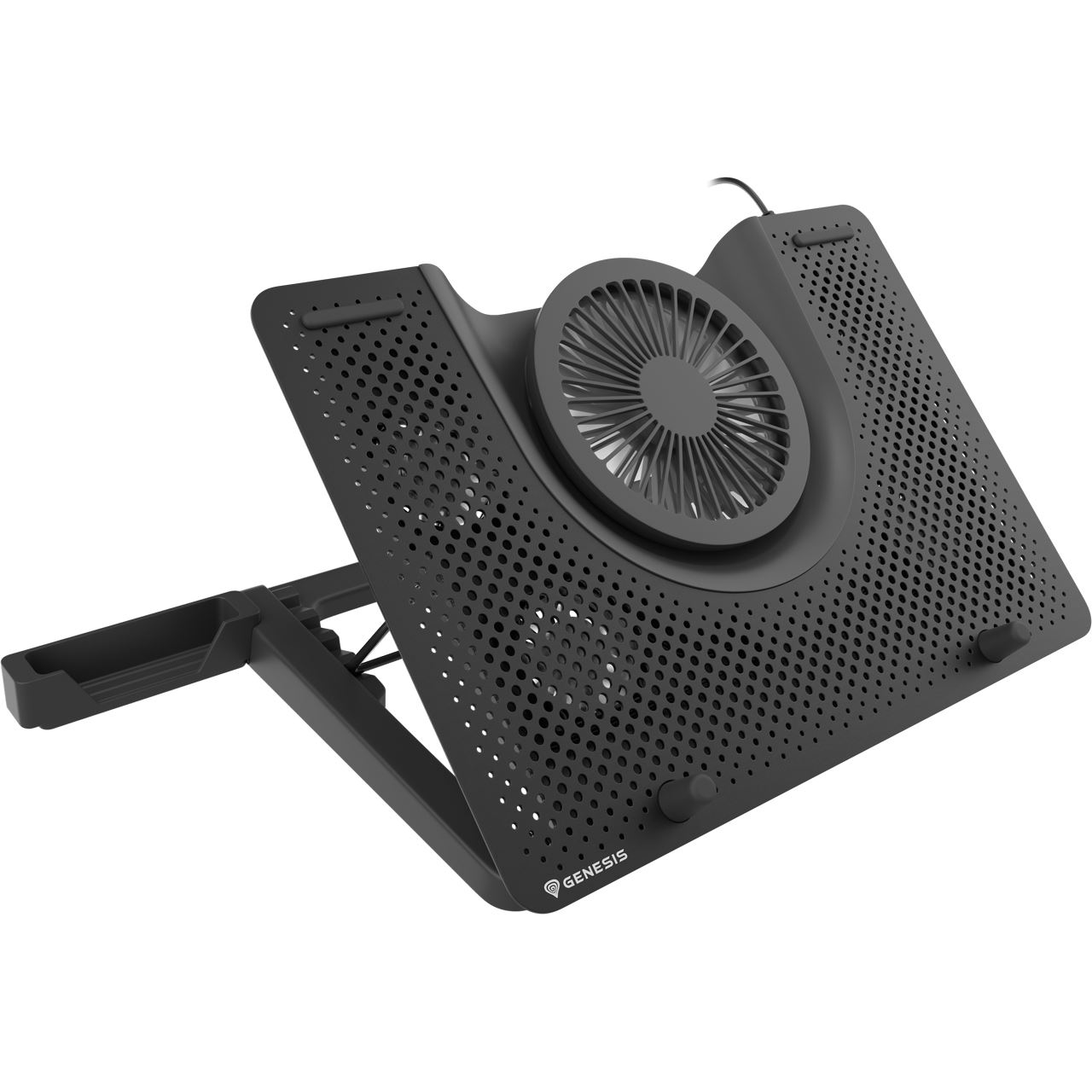 GENESIS Oxid 550. Maximale Bildschirmgröße: 43,9 cm (17.3"), Anzahl integrierter Kühlungslüfter: 5 Stück(e), Lüfterdurchmesser: 14 cm. Produktfarbe: Schwarz, Material: ABS, Aluminium, Farben der Beleuchtung: Rot. Hostschnittstelle: USB. Energiequelle: USB, Eingangsspannung: 5 V. Breite: 280 mm, Tiefe: 400 mm, Höhe: 55 mm