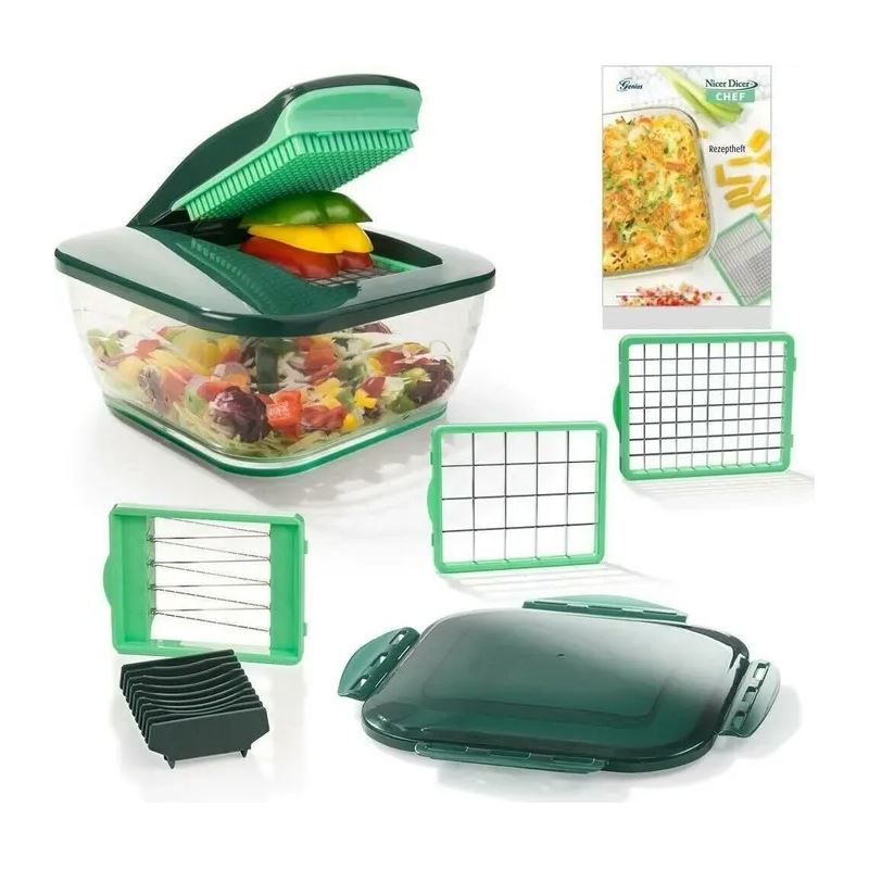 Genius Nicer Dicer Chef. Produktfarbe: Grün, Transparent, Gehäusematerial: Glas, Material Messer: Edelstahl. Gewicht: 1,7 kg