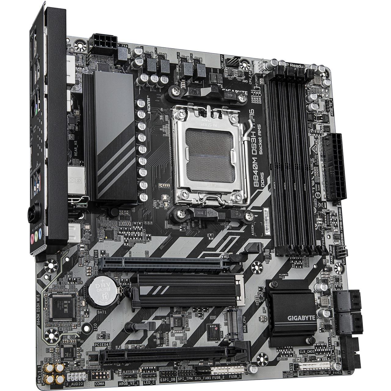 GIGABYTE B840M DS3H WIFI6 Mainboard – AMD Ryzen 9000 Prozessoren, 8+2+2 Phasen VRM, bis zu 8200 MHz DDR5, 2 x PCIe 4.0 M.2, Wi-Fi 6, 2,5 GbE LAN, USB 3.2 Gen 1. Prozessorhersteller: AMD, Prozessorsockel: Sockel AM5, Kompatible Prozessoren: AMD Ryzen 7000 Series, AMD Ryzen 8000 Series, AMD Ryzen 9000 Series. Unterstützte Arbeitsspeicher: DDR5-SDRAM, RAM-Speicher maximal: 256 GB, Arbeitsspeicher Typ: DIMM. Unterstützte Speicherlaufwerk-Schnittstellen: M.2, PCI Express 4.0, SATA III, Unterstützte Speicherlaufwerke: HDD & SSD, RAID Level: 0, 1, 5, 10. Maximale Auflösung: 4096 x 2160 Pixel. Ethernet Schnittstellen Typ: 2.5 Gigabit Ethernet, LAN-Controller: Realtek RTL8125, Top WLAN-Standard: Wi-Fi 6 (802.11ax)