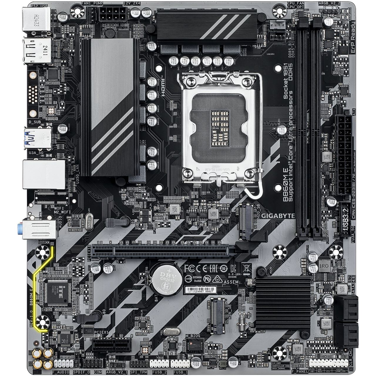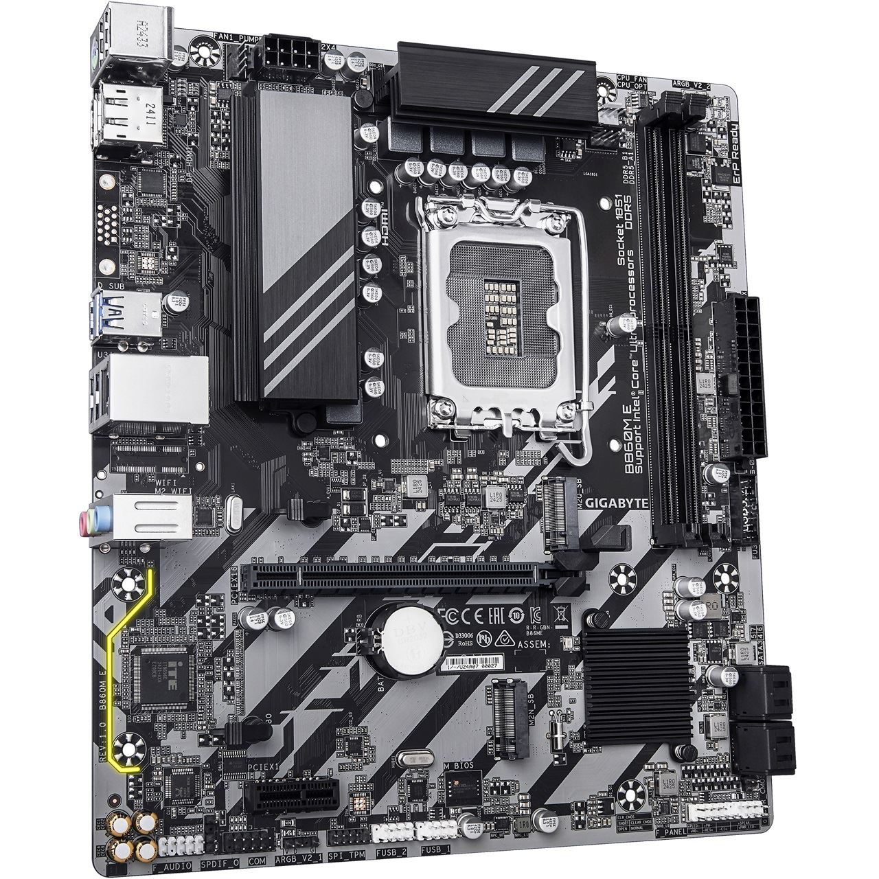 GIGABYTE B860M E Mainboard - Intel Core Ultra Series CPUs, 4+1+2 Phasen VRM, bis zu 8800MHz DDR5 (O.C), 2xPCIe 4.0 M.2, 1GbE LAN, USB 3.2 Gen 1. Prozessorhersteller: Intel, Prozessorsockel: LGA 1851 (Socket V1), Kompatible Prozessoren: Intel Core Ultra (Series 2). Unterstützte Arbeitsspeicher: DDR5-SDRAM, RAM-Speicher maximal: 128 GB, Arbeitsspeicher Typ: DIMM. Unterstützte Speicherlaufwerk-Schnittstellen: M.2, PCI Express 4.0, SATA III, Unterstützte Speicherlaufwerke: HDD & SSD, RAID Level: 0, 1, 5, 10. Maximale Auflösung: 4096 x 2160 Pixel. Ethernet Schnittstellen Typ: Gigabit Ethernet, LAN-Controller: Realtek RTL8111H