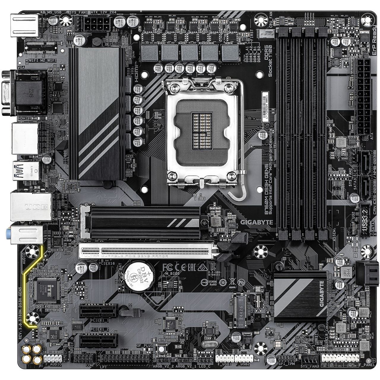GIGABYTE B760M DS3H GEN5 Mainboard – Unterstützt Intel Core Prozessoren der 14. Generation, digitales VRM mit 6+2+1 Phasen, bis zu 5600 MHz DDR5, 2 x PCIe 4.0 M.2, 2.5GbE LAN, USB 3.2 Gen2. Prozessorhersteller: Intel, Prozessorsockel: LGA 1700, Kompatible Prozessoren: Intel® Celeron®, Intel Core i3 12th Gen, Intel Core i3 13th Gen, Intel Core i3 14th Gen, Intel.... Unterstützte Arbeitsspeicher: DDR5-SDRAM, RAM-Speicher maximal: 256 GB, Arbeitsspeicher Typ: DIMM. Unterstützte Speicherlaufwerk-Schnittstellen: M.2, PCI Express 4.0, SATA III, Unterstützte Speicherlaufwerke: HDD & SSD, RAID Level: 0, 1, 5, 10. Maximale Auflösung: 4096 x 2304 Pixel. Ethernet Schnittstellen Typ: 2.5 Gigabit Ethernet, LAN-Controller: Realtek RTL8125