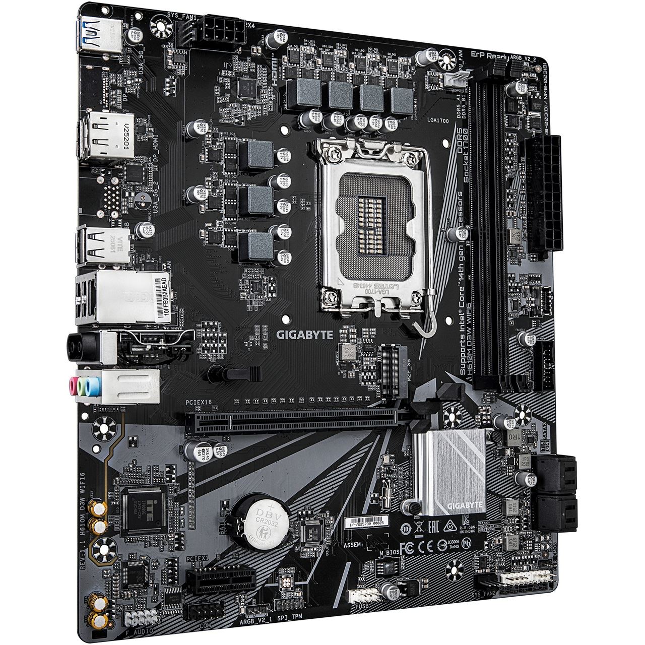 GIGABYTE H610M D3W WIFI6 Mainboard - Unterstützt Intel Core Prozessoren der 14. Generation, 5+1+1 Phasen VRM, bis zu 5600MHz DDR4, 1xPCIe 3.0 M.2, Wi-Fi 6, 1GbE LAN, USB 3.2 Gen 1. Prozessorhersteller: Intel, Prozessorsockel: LGA 1700, Kompatible Prozessoren: Intel® Celeron®, Intel Core i3 12th Gen, Intel Core i3 13th Gen, Intel Core i3 14th Gen, Intel.... Unterstützte Arbeitsspeicher: DDR5-SDRAM, RAM-Speicher maximal: 128 GB, Arbeitsspeicher Typ: DIMM. Unterstützte Speicherlaufwerk-Schnittstellen: M.2, PCI Express 3.0, SATA III, Unterstützte Speicherlaufwerke: HDD & SSD. Maximale Auflösung: 4096 x 2160 Pixel. Ethernet Schnittstellen Typ: Gigabit Ethernet, LAN-Controller: Realtek RTL8111H, Top WLAN-Standard: Wi-Fi 6 (802.11ax)