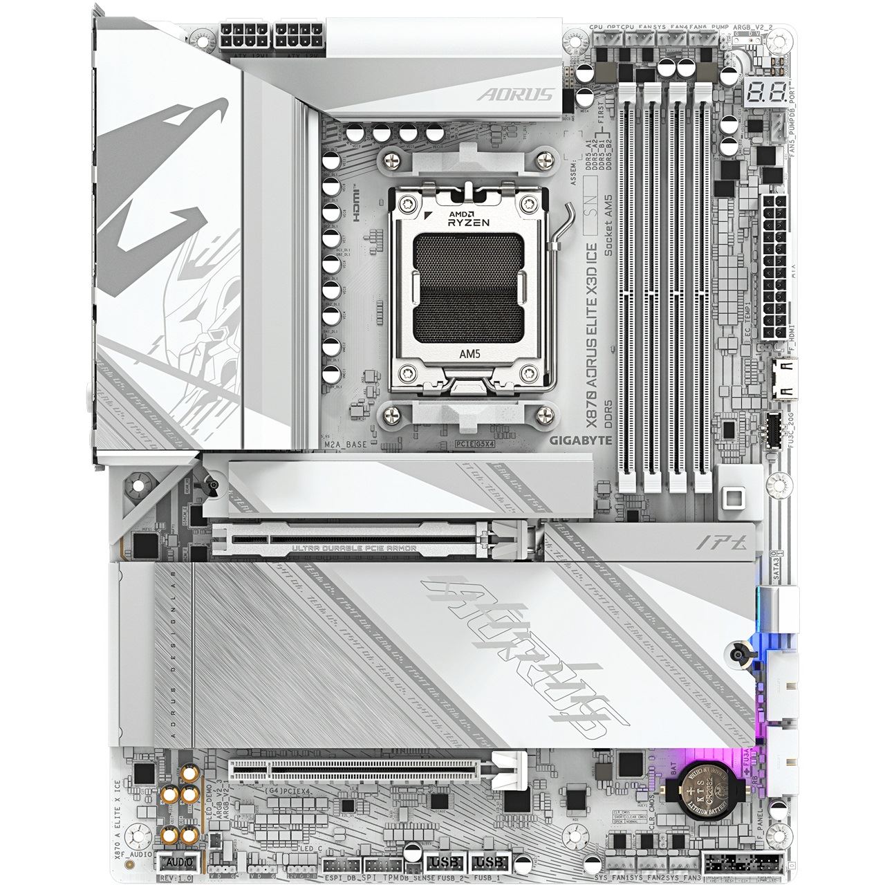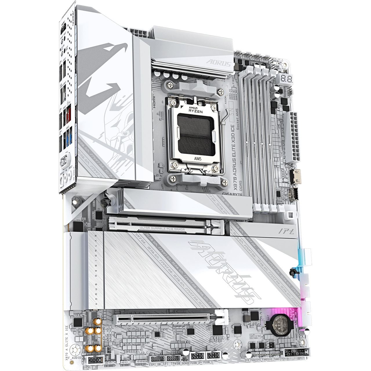 GIGABYTE X870 AORUS ELITE X3D ICE Mainboard - Unterstützt AMD Ryzen 9000 Prozessoren, 16+2+2 Phasen Digital-VRM, bis zu 9000Hz DDR5 (OC), 2xPCIe 5.0 + 2xPCIe 4.0, Wi-Fi 7, 2.5GbE LAN, USB 4. Prozessorhersteller: AMD, Prozessorsockel: Sockel AM5, Kompatible Prozessoren: AMD Ryzen 7000 Series, AMD Ryzen 8000 Series, AMD Ryzen 9000 Series. Unterstützte Arbeitsspeicher: DDR5-SDRAM, RAM-Speicher maximal: 256 GB, Arbeitsspeicher Typ: DIMM. Unterstützte Speicherlaufwerk-Schnittstellen: M.2, PCI Express 4.0, PCI Express 5.0, SATA III, Unterstützte Speicherlaufwerke: HDD & SSD, RAID Level: 0, 1, 5, 10. Maximale Auflösung: 4096 x 2304 Pixel. Ethernet Schnittstellen Typ: 2.5 Gigabit Ethernet, 5 Gigabit Ethernet, Schnelles Ethernet, Gigabit Ethernet, LAN-Controller: Realtek RTL8126, Top WLAN-Standard: Wi-Fi 7 (802.11be)