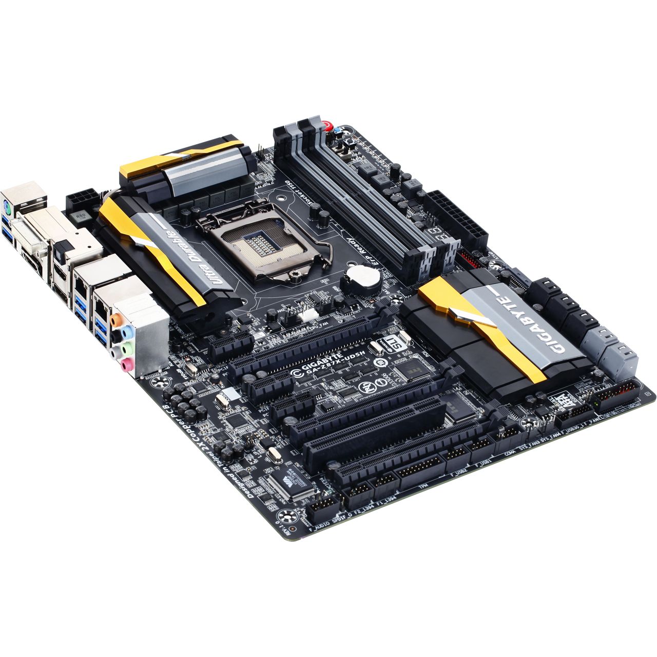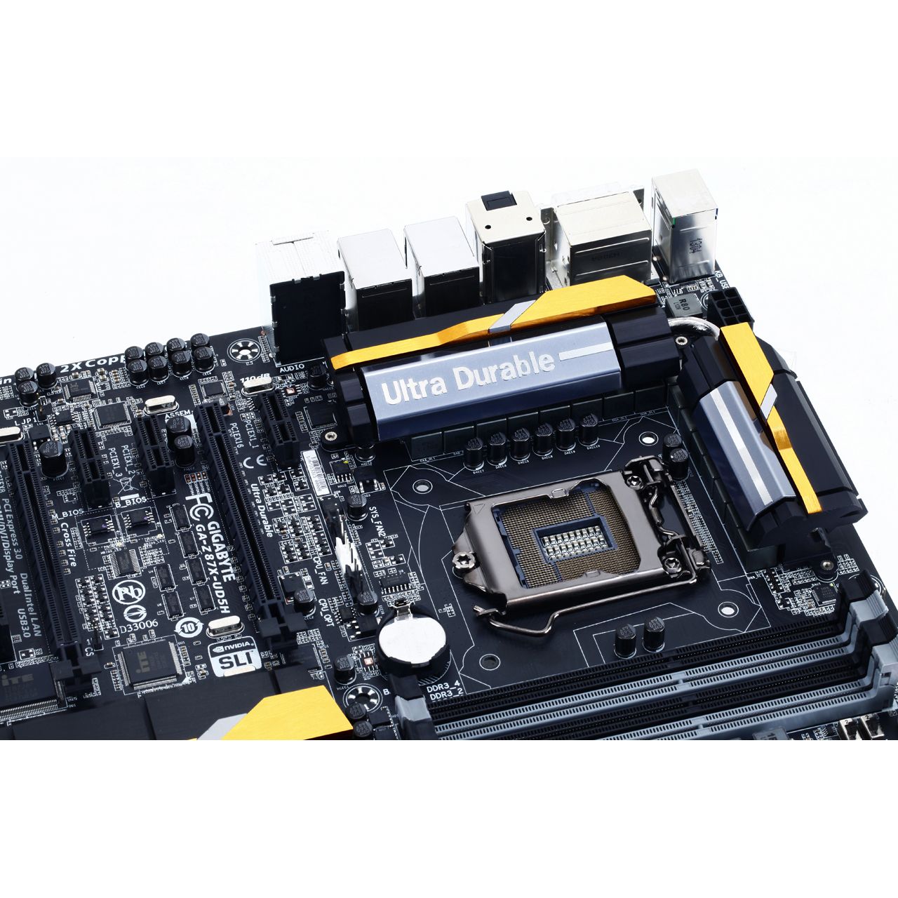 Beim Gigabyte Z87X-UD5H handelt es sich um ein üppig ausgestattetes Z87-Mainboard, das besonders für schnelle Quadcore-Prozessoren der Core-i7- oder Core-i5-Reihe die ideale Basis darstellt. Das schwarz-gelbe Board kommt mit vier DIMM-Slots für DDR3-Arbeitsspeicher im schnellen Dual-Channel-Mode. Als Soundchip ist der ALC898 an B(o)ard, der über 6 Buchsen 7.1-Sound ausgeben kann.