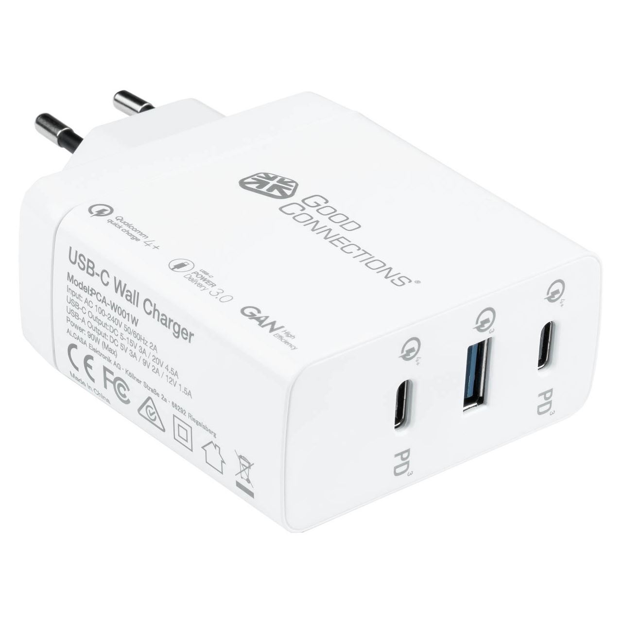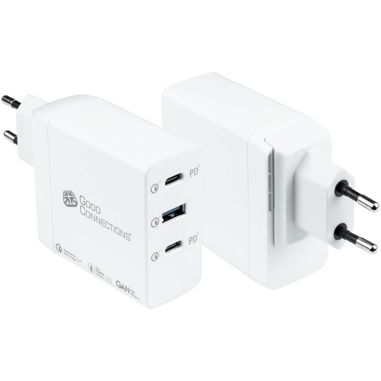 Good Connections USB-Schnellladegerät 90W mit GaN-Technologie, 3-Port (2x USB-CÖ und 1x USB-A), PD 3.0, QC 4+, weiß,