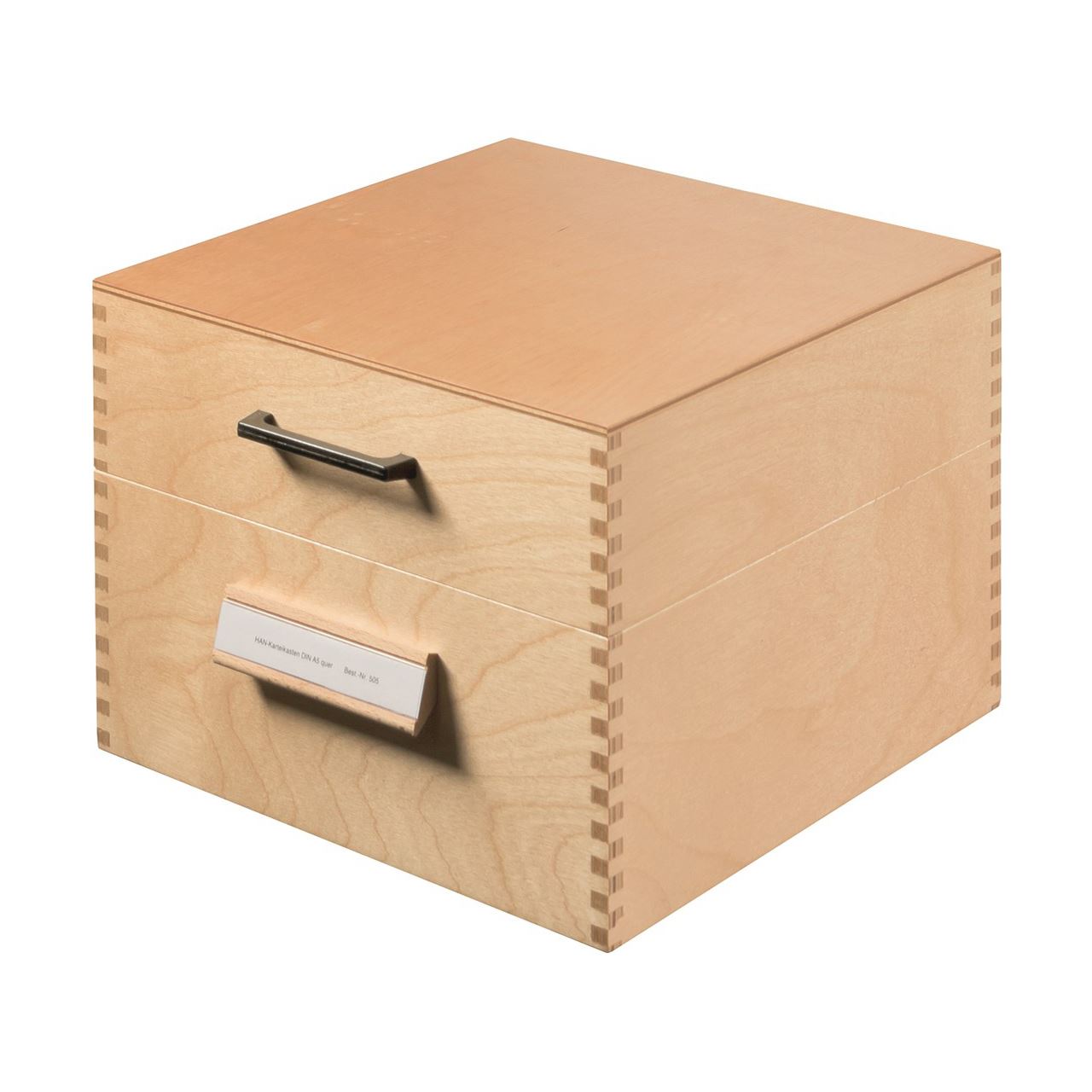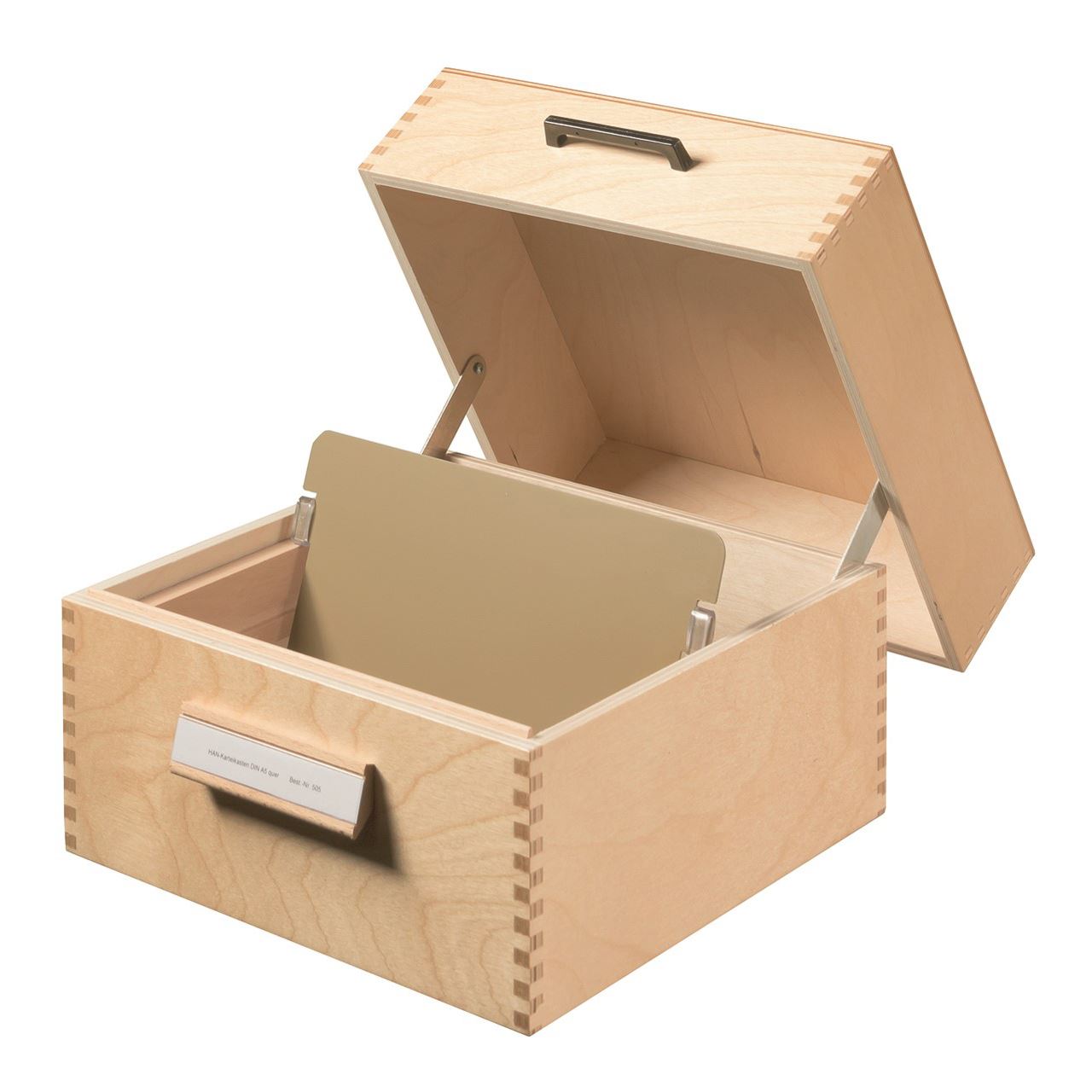 Karteikasten DIN A5 quer, für 900 Karten, inkl. einer Metallstütze. In hochwertiger Erbstück-Qualität schlicht, zeitlos, langlebig und extrem strapazierfähig. Die individuelle Holzstruktur unterstreicht die Besonderheit dieses edlen Naturprodukts. Mit solidem Metallboden, stabiler Metallstütze sowie wegklappbarem Deckel mit Griff und Beschriftungsfeld. Rutschfest durch möbelschonende Filzfüße. Fassungsvermögen: 900 Karten. Verwendung für Kartenformat: DIN A5 quer. Zubehör optional: Register A-Z DIN A5, quer (Art.-Nr. 985) und DIN A5 Metallstütze (Art.-Nr. 5). Made in the EU. Außenmaße (B x T x H): 255 x 250 x 190 mm. Material: Holz (Birke). Farbe: naturholz.