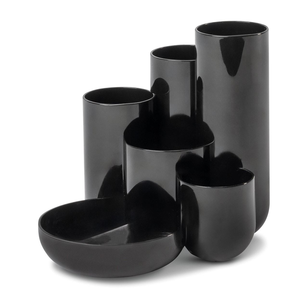 Schreibtischköcher CAMPUS mit 5 in Höhe und Durchmesser unterschiedlichen Röhren und 1 flachen Schale zur Kleinteile-Organisation. Die moderne Interpretation eines Büroklassikers – zeitgemäßes Design trifft auf hohe Qualität. Der elegante Schreibtischköcher eignet sich zur Organisation und Ablage von Schreibtisch, Beauty- oder Künstlerbedarf. Die glänzenden Oberflächen harmonieren mit den geschwungenen Formen. In den 5 Röhren finden auch längere und/oder schwere Gegenstände einen sicheren Stand. Kleinteile lassen sich perfekt in der Schale unterbringen. Die große Grundfläche sorgt auch in gefülltem Zustand für einen sicheren Stand. Made in Germany. Außenmaße (B x T x H): 131 x 154 x 137 mm. Material: hochwertiger Kunststoff, Polystyrol (PS).