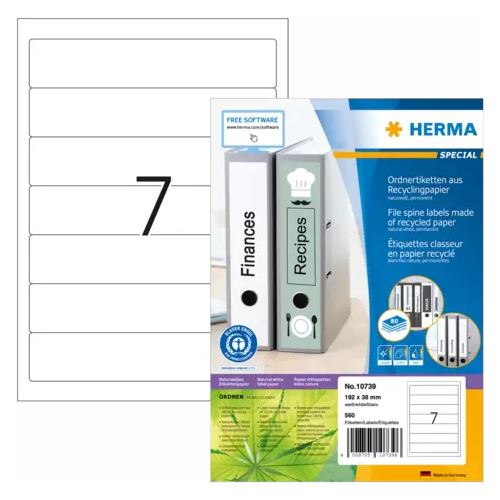 HERMA 10739. Produktfarbe: Weiß, Etikettentyp: Selbstklebendes Druckeretikett, Typ: Gestanztes Etikett. Nachhaltigkeitszertifikate: Blue Angel, Enthält nicht: Säure, Lösungsmittel. Etikettenbreite: 19,2 cm, Etikettenhöhe: 3,9 cm. Aufkleber pro Satz: 560 Stück(e), Medienanzahl pro Paket: 80 Blätter, Haftetiketten pro Blatt: 7 Stück(e)