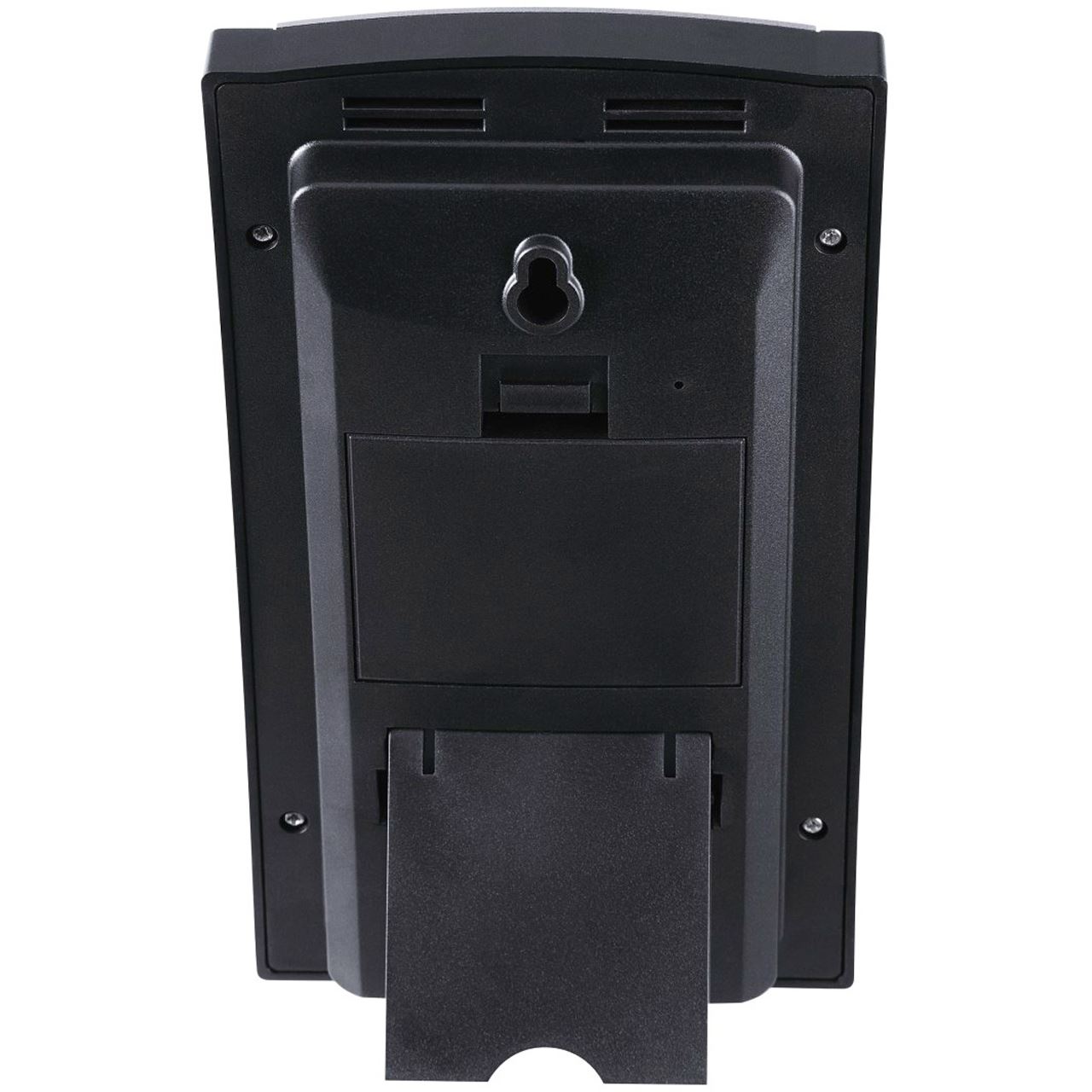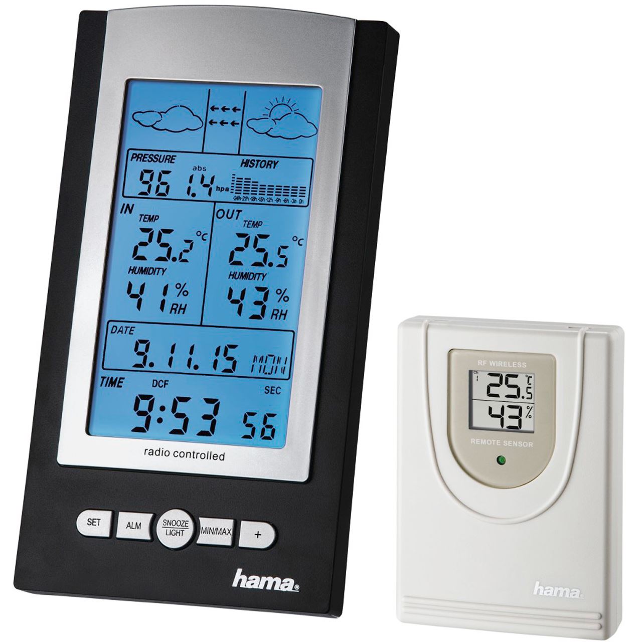 - zweiteiliges Set, bestehend aus Basisstation und Funk-Außensensor (Reichweite: max. 100 m, 433 MHz) für digitale Wetterbeobachtung und exakte Uhrzeit (DCF-Funkuhr) ,- Batteriekapazitätsanzeige ,- Außenfühler mit Display ,(Temperatur-/Luftdruckanzeige) ,- Montagemöglichkeit an der Wand oder zum Aufstellen ,- Batterien (3x AA Mignon, 2x AAA Micro) nicht im Lieferumfang enthalten ,- Farbe: Schwarz/Silber , ,- Thermometer: ,- Messbereich innen: 0°C bis +60°C ,- Messbereich außen: -40°C bis +65°C ,- umschaltbar zwischen °C und Fahrenheit ,- max./min. Datenspeicher für Innen- und Außentemperatur , ,- Barometer: ,- Luftdruckverlauf der letzten 24 Stunden (Balkenanzeige) ,- Wettervorhersage (sonnig, leicht bewölkt, wolkig, regnerisch) , ,- Hygrometer: ,- Luftfeuchtigkeit innen: 1% bis 99% ,- Luftfeuchtigkeit außen: 20% bis 95% ,- max./min. Datenspeicher für Luftfeuchtigkeit , ,- Uhr-/Kalenderfunktion: ,- DCF-Funkuhr (automatische Zeitanpassung an die genaueste Uhr der Welt) ,- umschaltbar 12-/24-h-Format)