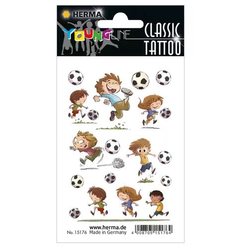 Kein Kindergeburtstag ohne Klebetattoos! Die süßen Tattoos sind genau das Richtige für Fussball-Geburtstage: Egal ob für Jungen oder Mädchen, die liebevoll gestalteten Tattoos "Colour I Soccers" sind für alle Kinder etwas, dessen Herzen für Fussball schlagen. Die Motive sind farbig gestaltet und zeigen Jungs und Mädels, die viel Spaß beim Fussball spielen haben. Zusätzlich sind klassische Fussbälle in schwarz-weiß in der Verpackung enthalten, sodass zwischen unterschiedlichen Designs ausgewählt werden kann. Auch zur Fussball-Weltmeisterschaft oder bei eigenen Spielen sind die Tattoos für die kleinen Fans geeignet. Die witzigen Tattoos bestehen aus abwaschbarer Transferfolie, die sich einfach auftragen und wieder entfernen lässt. In einer Verpackung befinden sich 12 Tattoos, die in Deutschland produziert wurden.