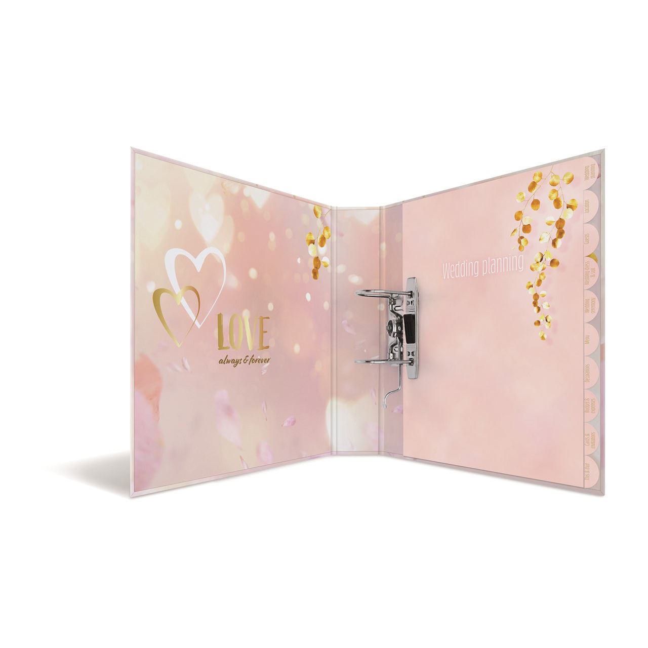Bald läuten die Hochzeitsglocken und der schönste Tag im Leben zweier Liebenden rückt näher und näher. Doch bevor der Traum einer perfekten Hochzeit wahr wird, müssen Sie im Vorfeld Ihr Organisationstalent unter Beweis stellen. Der Hochzeitsordner von HERMA hilft Ihnen dabei. Viele Dinge müssen geplant und organisiert werden: Wo findet die Trauung statt? Wer wird eingeladen? Wie sieht die Tischdekoration aus? Dieser hübsche und modern gestaltete Ordner hilft Ihnen bei der Archivierung aller wichtigen Hochzeitsunterlagen und sorgt dafür, dass keine Dokumente, Listen oder Notizen verloren gehen. Im handlichen DIN A4 Format lässt er sich einfach überall hin transportieren, sodass Sie alle notwendigen Papiere immer dabei haben. Die hochwertige Hebelmechanik und der Niederhalter aus Metall halten den Ordnerinhalt eng beisammen, sodass dieser nicht verdreckt wird oder herausfallen kann. Das ill ustrierte und übersichtliche Register hilft Ihnen bei der Planung und berücksichtigt alle Punkte, die für eine Hochzeit wichtig sind, wie z.B. die Organisation der Tischdeko, des Caterings, der Gästeliste uvm. Ihre Termine sind sofort, immer und überall griffbereit. Mit dem 60 mm breiten Ordnerrücken und dem 300 x 315 Format ist für ausreichend Platz gesorgt.