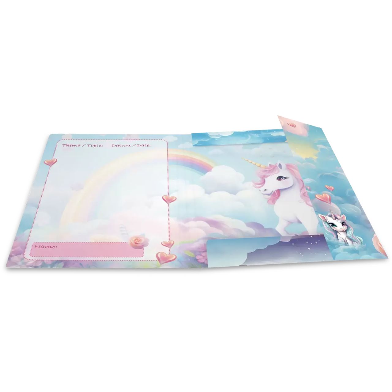 Eintauchen in die magische Welt der Happy Unicorns! Diese liebevoll gestaltete Sammelmappe für das Format DIN A4 aus Karton, ist der ideale Begleiter für alle Einhorn-Fans. Die fröhlichen Einhörner mit großen, strahlenden Augen und weichem, hellblauem Fell bringen jedes Gesicht zum Strahlen. Der Hintergrund, verziert mit bunten Wolken, Herzen, Blüten und Regenbögen, verleiht jedem Kinderzimmer oder Schulranzen einen Hauch von Magie. Diese Einhorn-Sammelmappe ist perfekt für kleine Prinzessinnen und Prinzen, die Wert auf Stil und Ordnung legen. Ein Muss für alle, die ihre Schulunterlagen, Bilder und Zeichnungen fantasievoll und ordentlich aufbewahren möchten!