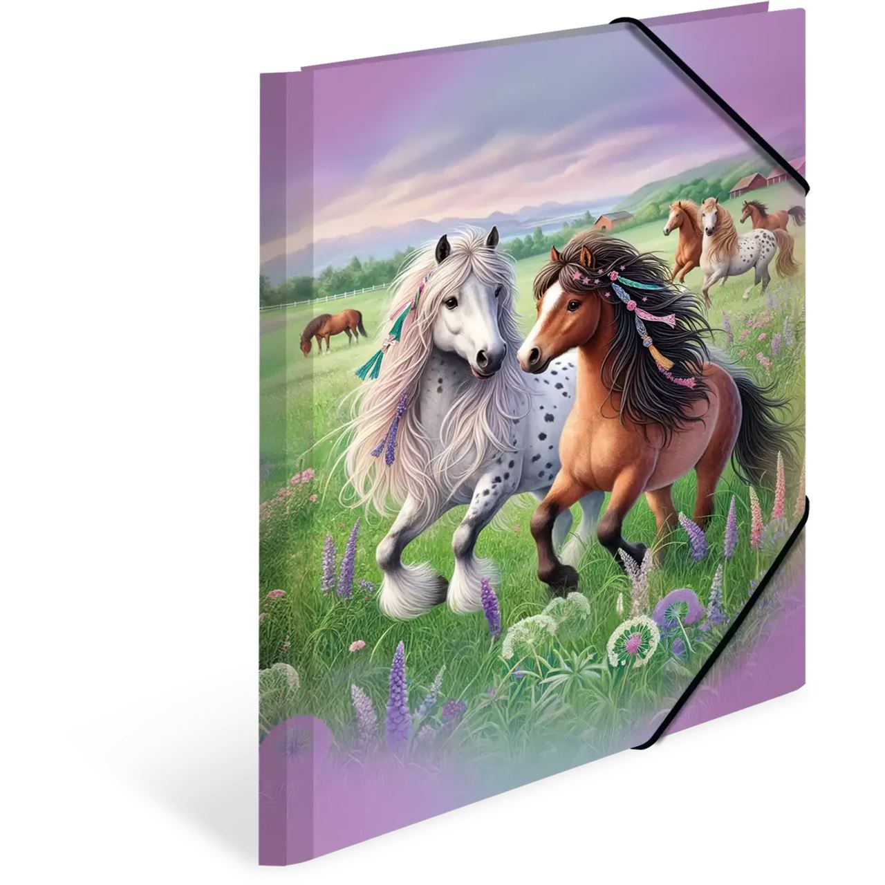 Die Sammelmappe "Pferdewelt" entführt in eine zauberhaft schöne Landschaft, die die Herzen von Pferdefans höher schlagen lässt. Die liebevollen Zeichnungen zeigen verspielte Pferde mit wallenden Mähnen, in die Zöpfe, Perlen und bunte Bänder eingeflochten sind. Auf einer blühenden Wiese tummeln sich mehrere dieser schönen Tiere, umgeben von lila Blumen, die dem Bild eine romantische Note verleihen. Der sanfte, zartlila Himmel schafft eine harmonische Atmosphäre und lädt zum Träumen ein. Diese Sammelmappe für das Format DIN A4 vereint Funktionalität mit einem ansprechenden Design und ist ideal für die Aufbewahrung von Schulunterlagen, kreativen Projekten oder persönlichen Erinnerungen. Die liebevolle Gestaltung strahlt Unbeschwertheit aus und vermittelt das Gefühl von Freiheit und Ruhe. Die Sammelmappe "Pferdewelt" bringt Freude in den Alltag und ist perfekt für alle, die die ländliche Idylle und die Liebe zu Pferden schätzen. Ein stilvolles Accessoire für kleine und große Pferdefans, das die Leidenschaft für diese fantastischen Tiere auf besondere Weise festhält.