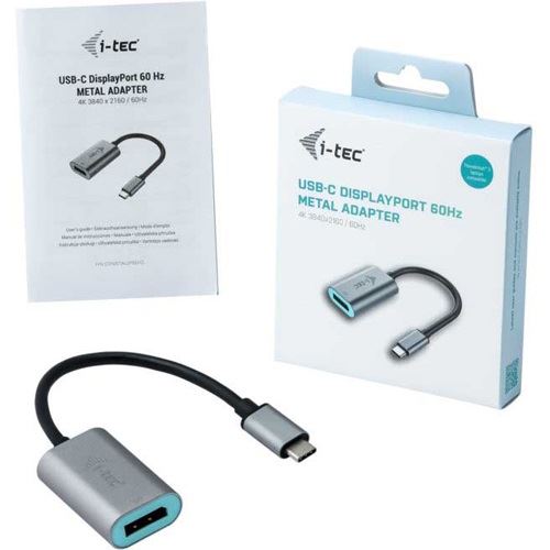 i-tec Metal USB-C Display Port Adapter 4K/60Hz. Kabellänge: 0,15 m, Anschluss 1: USB Typ-C, Anschluss 2: Display Port. Gewicht: 27 g, Breite: 45 mm, Tiefe: 30 mm. Verpackungsbreite: 145 mm, Verpackungstiefe: 130 mm, Verpackungshöhe: 25 mm. Menge pro Packung: 1 Stück(e)