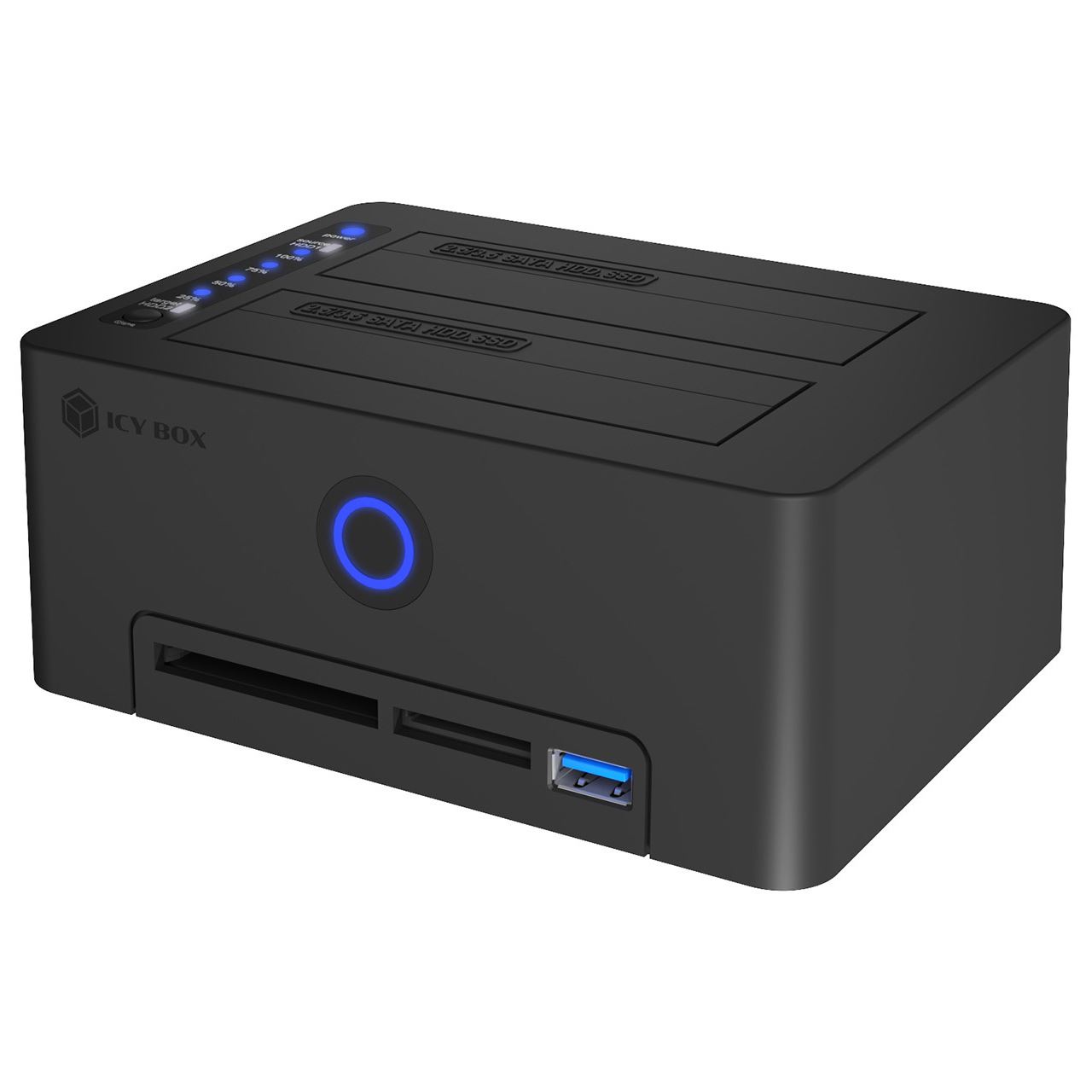 ICY BOX IB-1233CL-CR, HDD Docking & Klonstation mit Kartenlesern CF + SD und USB Hub, USB 3.2 Gen1 (5 Gbit/s). Speichermedien Typ: HDD, SSD, Speicherlaufwerk Schnittstelle: SATA, unterstützte Speicherlaufwerksgrößen: 2.5,3.5". Hostschnittstelle: USB 3.2 Gen 1 (3.1 Gen 1) Type-A. Produktfarbe: Schwarz, Max. Datenübertragungsrate: 5 Gbit/s, Kompatible Speicherkarten: CF, SD. Ausgangsspannung: 12 V. Breite: 15 mm, Tiefe: 110 mm, Höhe: 62 mm