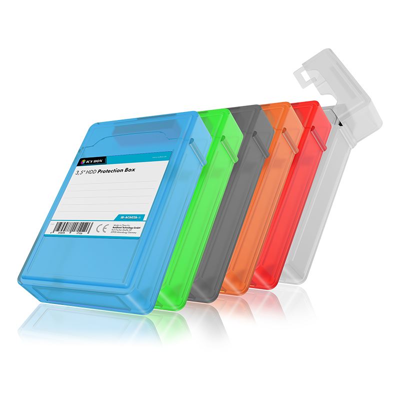ICY BOX IB-AC602b-6, 3,5" HDD Schutzbox, transparent, 6 Farben (weiß, grau, rot, grün, blau, orange). Etui-Typ: Beuteltasche, Material: Kunststoff, Produktfarbe: Blau, Grün, Grau, Orange, Rot, Weiß. Breite: 117 mm, Tiefe: 162 mm, Höhe: 38 mm. Verpackungsbreite: 95 mm, Verpackungstiefe: 116 mm, Verpackungshöhe: 133 mm. Menge pro Packung: 6 Stück(e). Ursprungsland: China, Anzahl Produkte pro Versandkarton: 20 Stück(e)