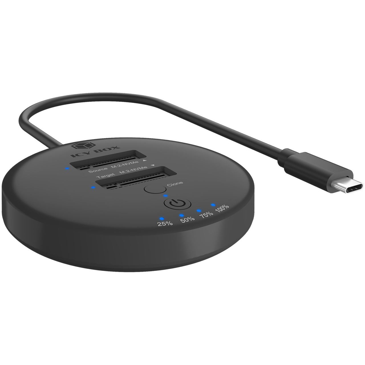 ICY BOX IB-1612MCL-C31, Docking- & Clonestation für 2x M.2 NVMe, USB 3.2 Gen 2 Type-C®, 10 Gbit/s, für 22x30/42/60/80 mm,. Speichermedien Typ: SSD, unterstützte Speicherlaufwerksgrößen: M.2. Hostschnittstelle: USB 3.2 Gen 2 (3.1 Gen 1) Type-C. Produktfarbe: Schwarz, Material: Acrylnitril-Butadien-Styrol (ABS), Max. Datenübertragungsrate: 10 Gbit/s. Ausgangsspannung: 5 V, Ausgangsstrom: 3 A. Breite: 75 mm, Tiefe: 75 mm, Höhe: 15 mm