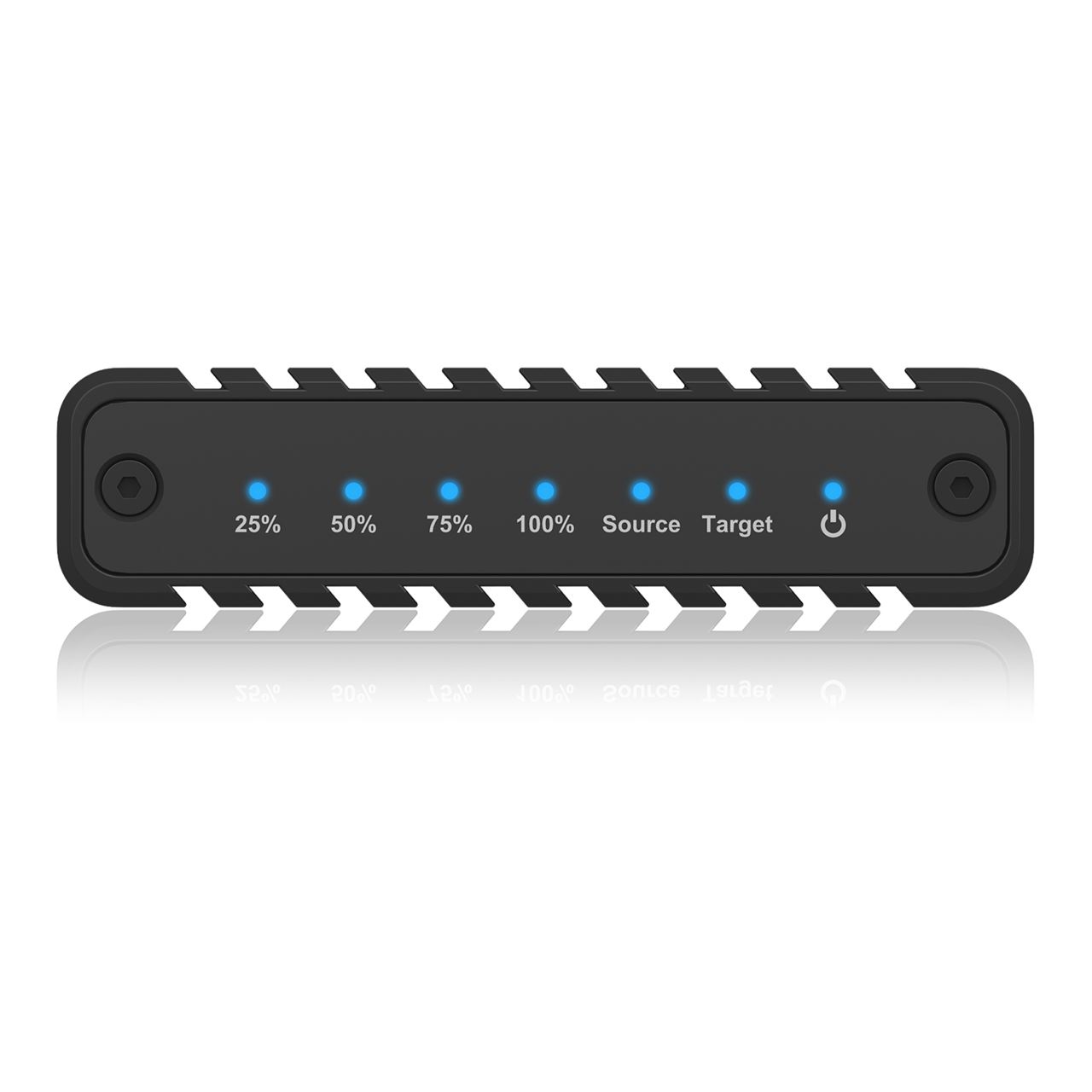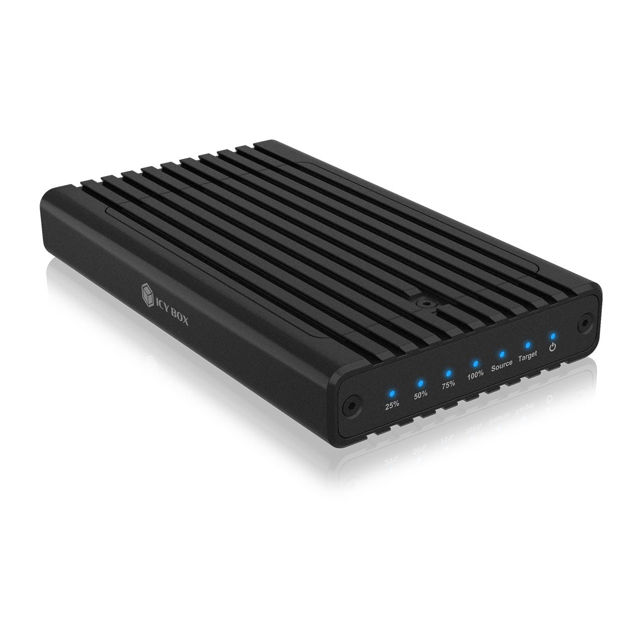 ICY BOX IB-2817MCL-C31, 2-fach M.2 PCIe NVMe CloneStation & DockingStation, USB 3.2 Gen 2 Type-C®/A, für 22x30/42/60/80 mm, Aluminium, schwarz. Produkttyp: SSD-Gehäuse. Anzahl der unterstützten Speicherlaufwerke: 2, Größe des Speicherlaufwerks: M.2, Unterstützte Speicherlaufwerk-Schnittstellen: PCI Express, Max. Speicherkapazität: 2 TB. Datenübertragungsrate: 10 Gbit/s. Produktfarbe: Schwarz. USB-Stecker: USB Typ-C