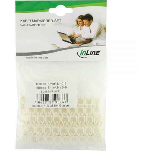 InLine 100er Pack Kabelmarkierer 6mm, Nr.0-9, weiß. Material: Kunststoff, Produktfarbe: Weiß. Gewicht: 13 g, Verpackungsbreite: 120 mm, Verpackungstiefe: 180 mm. Menge pro Packung: 100 Stück(e)