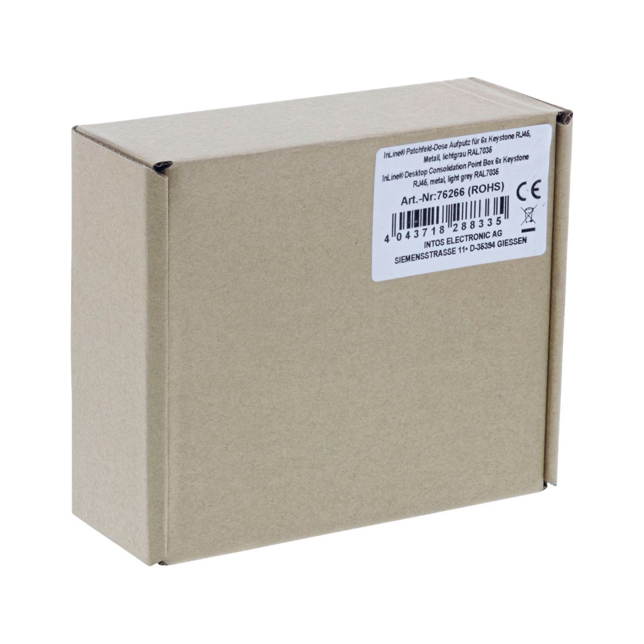 InLine Patchfeld-Dose Aufputz für 6x Keystone RJ45, Metall, lichtgrau RAL7035. Produktfarbe: Grau, Material: Kunststoff, Stahl. Abmessungen (BxTxH): 45 x 125 x 113 mm, Breite: 45 mm, Höhe: 113 mm. Verpackungsbreite: 120 mm, Verpackungstiefe: 140 mm, Verpackungshöhe: 54 mm