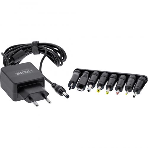 InLine Universal Steckernetzteil, 5V/15W, mit 8 Wechselsteckern Micro-USB USB-C. Eingangsspannung: 100 - 240 V, Eingangsfrequenz: 50 / 60 Hz. Ausgangsstrom: 3000 mA. Produktfarbe: Schwarz. Kabellänge: 1,8 m, Breite: 45 mm, Tiefe: 105 mm. Verpackungsbreite: 120 mm, Verpackungstiefe: 166 mm, Verpackungshöhe: 80 mm
