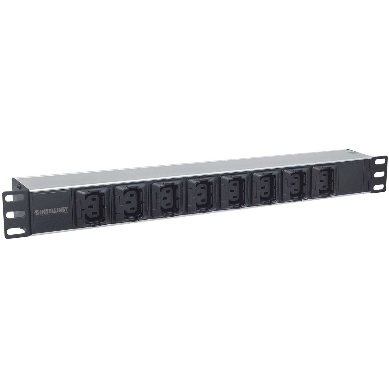 Intellinet 19" 8-fach Steckdosenleiste mit C13-Kaltgerätesteckdosen und Kabelklemmen, PDU mit abnehmbarem Stromkabel (2 m) und rückseitigem C20-Stromeingang, 1 HE. Rack-Kapazität: 1U, Produktfarbe: Schwarz, Silber. Anzahl der AC-Ausgänge: 8 AC-Ausgänge, AC-Steckertypen: C13-Koppler, Eingang Verbindungstyp: IEC320 C14. Kabellänge: 2 m. Nominale Eingang Spannung: 110 - 250 V, Stromstärke (maximal): 16 A. Breite: 482,6 mm, Tiefe: 45 mm, Höhe: 45 mm