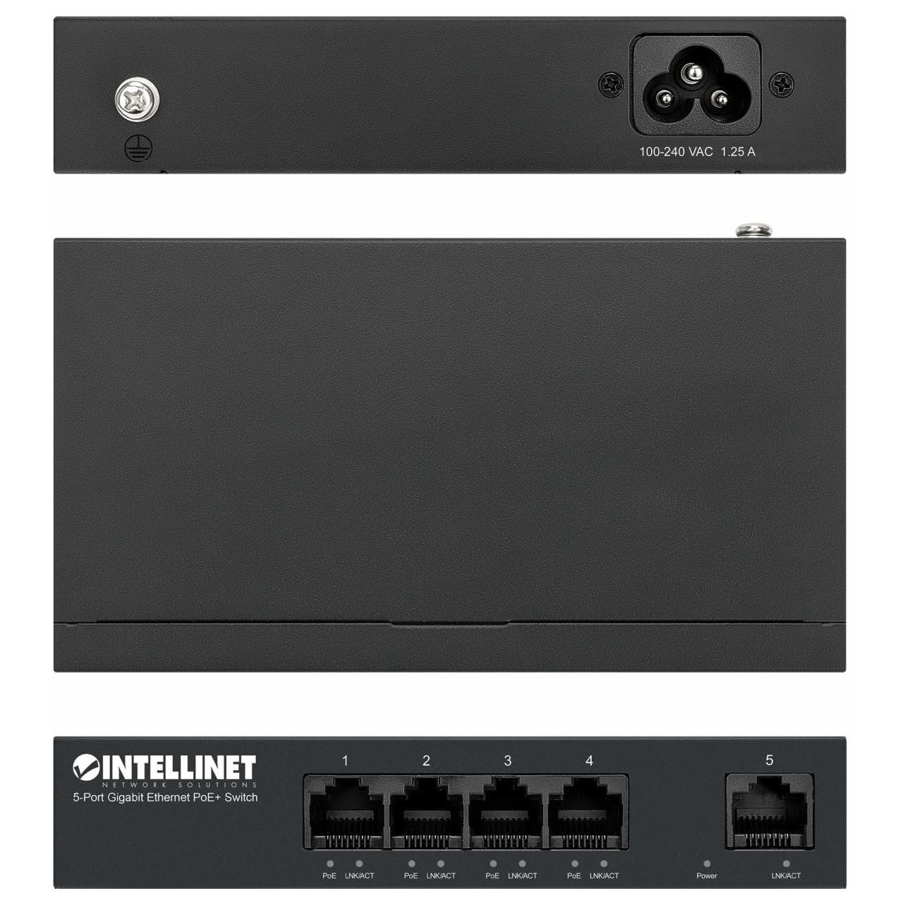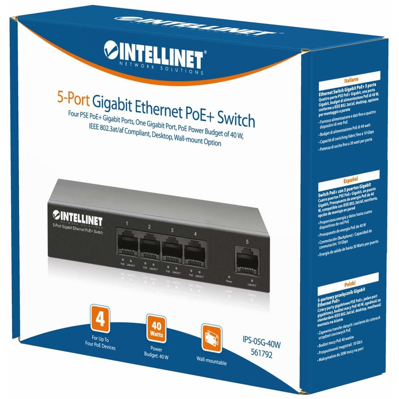 Intellinet 561792. Basic Switching RJ-45 Ethernet Ports-Typ: Gigabit Ethernet (10/100/1000), Anzahl der basisschaltenden RJ-45 Ethernet Ports: 5. Vollduplex. MAC-Adressentabelle: 2000 Eintragungen, Routing-/Switching-Kapazität: 10 Gbit/s. Netzstandard: IEEE 802.3, IEEE 802.3ab, IEEE 802.3af, IEEE 802.3at, IEEE 802.3u, IEEE 802.3x. Power over Ethernet (PoE). Wandmontage