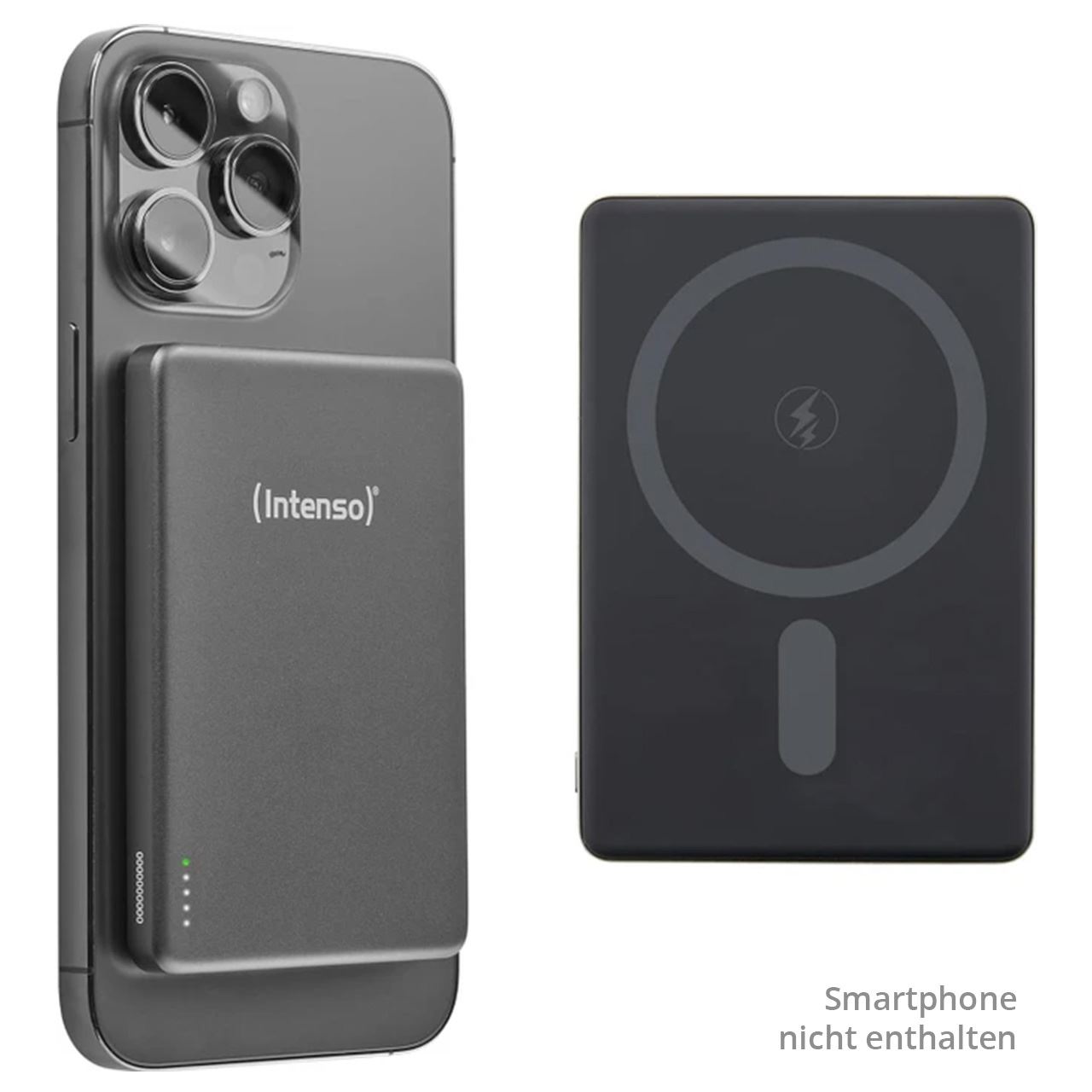 Intenso MW5000 Magnetische Powerbank 5000 mAh – MagSafe kompatibel, Wireless Charging 15W, USB-C PD 20W, Flach & Kompakt – Geprüft in Deutschland – Grau. Akku-/Batteriekapazität: 5000 mAh, Akku-/Batterietechnologie: Lithium Polymer (LiPo), Schnellladetechnik: Power Delivery, Programmable Power Supply (PPS), Akku-/Batteriespannung: 3,85 V. USB Typ-C Anzahl Anschlüsse: 1. Kabelloses Aufladen. Produktfarbe: Grau