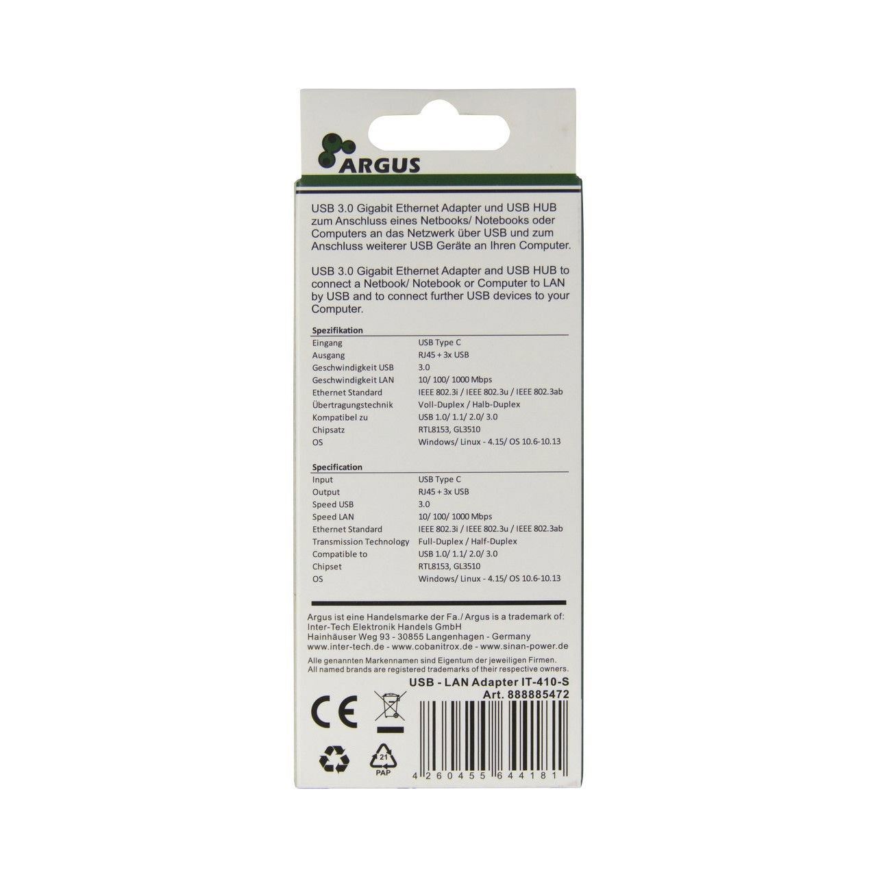 Inter-Tech Argus IT-410-S. Hostschnittstelle: USB 3.2 Gen 1 (3.1 Gen 1) Type-C. Netzstandard: IEEE 802.3ab, IEEE 802.3i, IEEE 802.3u. Produktfarbe: Grau, Hub-Schnittstellen: RJ-45, USB 3.2 Gen 1 (3.1 Gen 1) Type-A, LED-Anzeigen: LAN, USB. Energiequelle: USB. Unterstützt Windows-Betriebssysteme: Windows 10, Windows 7, Windows 8, Windows 8.1, Unterstützt Mac-Betriebssysteme: Mac OS X 10.10 Yosemite, Mac OS X 10.11 El Capitan, Mac OS X 10.12 Sierra, Mac OS X 10.13 High...