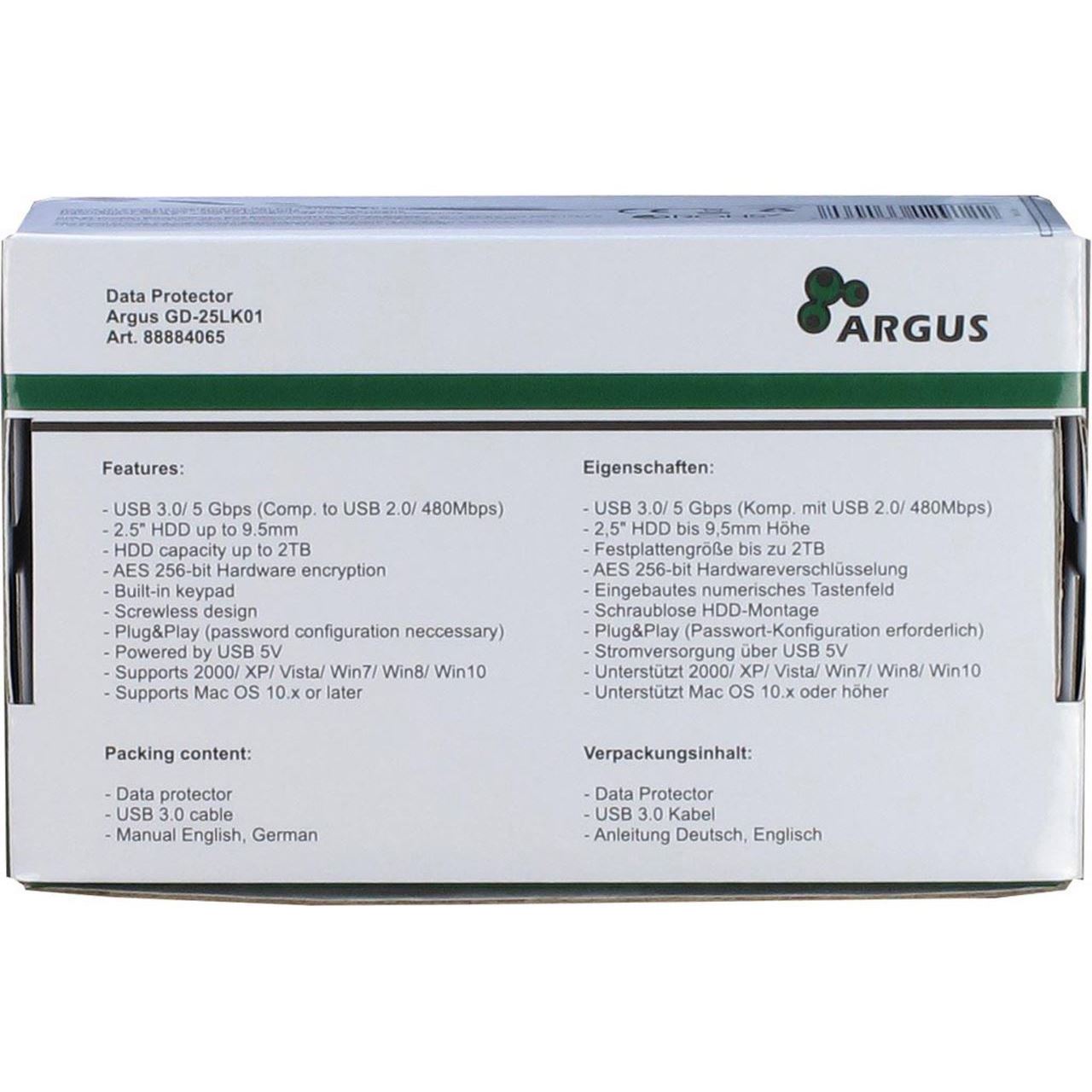 Mit dem Argus GD-25LK01 Festplattengehäuse schützen Sie Ihre Daten vor fremden Zugriffen. Durch die integrierte AES 256-bit Hardwareverschlüsselung und ein Tastenfeld lässt sich eine 2.5"-Festplatte mit einem Passwort vor unerwünschten Zugriffen schützen. Dank des eleganten Designs passt sich das Gehäuse auch jeder Umgebung an.