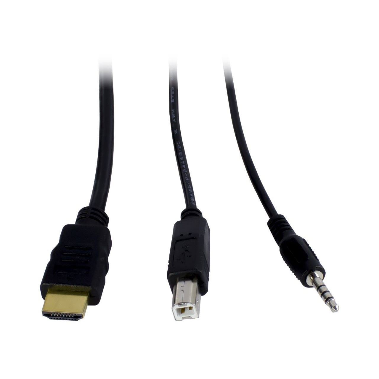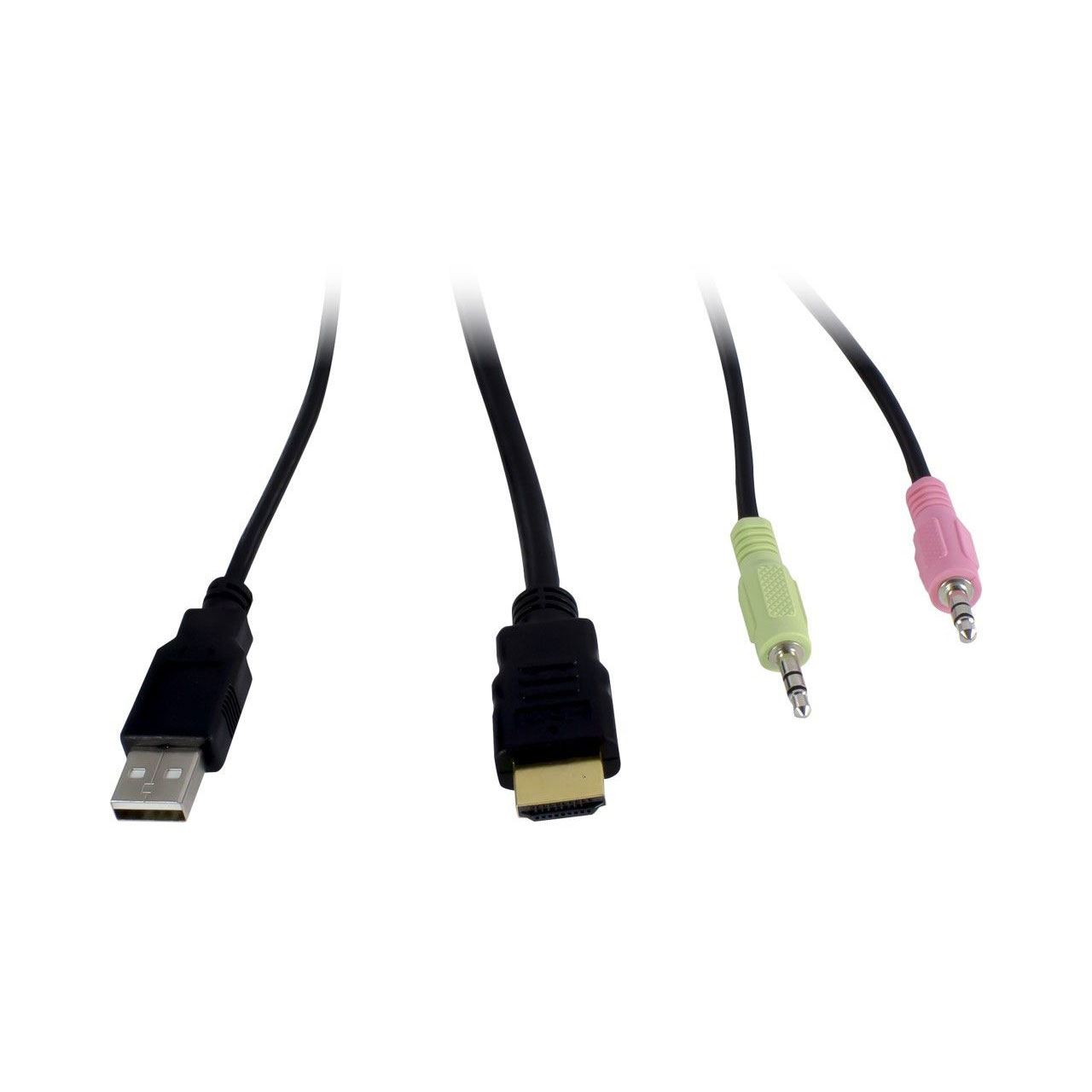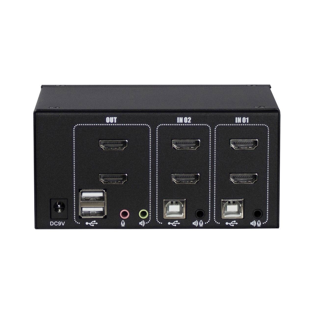 Der Anschluss des KVM erfolgt per USB (Tastatur / Maus), 2x 3,5mm Klinke (Audio Mic/Line) und Dual HDMI-Monitor über die zwei mitgelieferten Anschlusskabel sowie zwei weitere HDMI-Kabel (nicht im Lieferumfang) an die Computer.