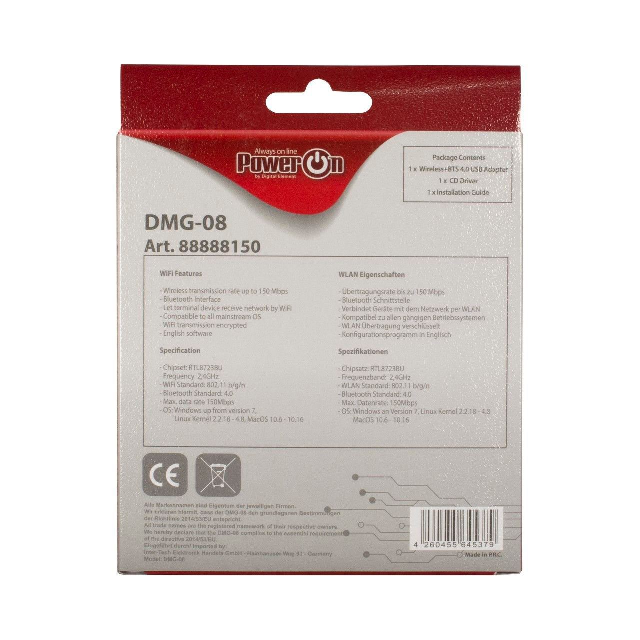 Inter-Tech DMG-08. Übertragungstechnik: Kabellos, Hostschnittstelle: USB, Schnittstelle: WLAN / Bluetooth. Maximale Datenübertragungsrate: 150 Mbit/s, Top WLAN-Standard: Wi-Fi 4 (802.11n), WLAN-Band: Einzelband (2,4GHz)