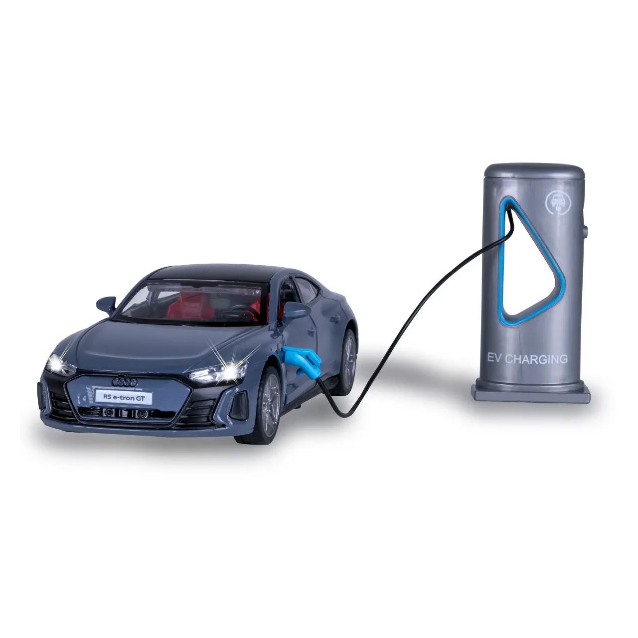 Der Audi RS e-tron GT ist ein hochleistungsstarker, vollelektrischer Sportwagen, der die Zukunft der Audi-Performance verkörpert. Mit beeindruckender Leistung und innovativer Technik setzt der RS e-tron GT neue Maßstäbe in der Elektromobilität und bietet eine aufregende Fahrerfahrung, die elektrischen Fahrspaß mit sportlicher Eleganz vereint. JAMARA bringt dieses einzigartige Fahrzeug im hochwertigen Metall DIECAST 1:36 Maßstab in Ihre Sammlervitrine – mit vielen kleinen Details, die jeden Fan begeistern werden. Das offiziell lizenzierte Modell überzeugt durch sein detailgetreues Design, das die kraftvolle Silhouette und moderne Linienführung des Originals perfekt widerspiegelt. Der Innenraum ist realitätsnah gestaltet und bietet Platz für eine kleine Spielfigur. Besonderes Highlight: Der simulierte Ladevorgang mit einer kleinen Ladesäule (ohne Funktion nur Spielwert), und ein realistischer Motorsound, der beim Drücken der Karosserie ertönt. Auch beim Öffnen der Türen gibt es authentische Geräusche wie einen Entriegelungston oder ein Beschleunigungsgeräusch beim Fahren. LED-Lichter vorne und hinten, profilierte Gummireifen sowie eine transparente Windschutzscheibe unterstreichen die hochwertige Verarbeitung. Die Türen lassen sich manuell öffnen und schließen, der kraftvolle Rückzugmotor bringt das Modell in Bewegung – und das alles gefertigt aus robustem DieCast-Metall für langanhaltenden Sammelspaß. Der Audi RS e-tron GT von JAMARA ist nicht nur ein futuristischer Blickfang für Ihre Vitrine, sondern auch ein Muss für jeden Sammler und Liebhaber innovativer Sportwagen.